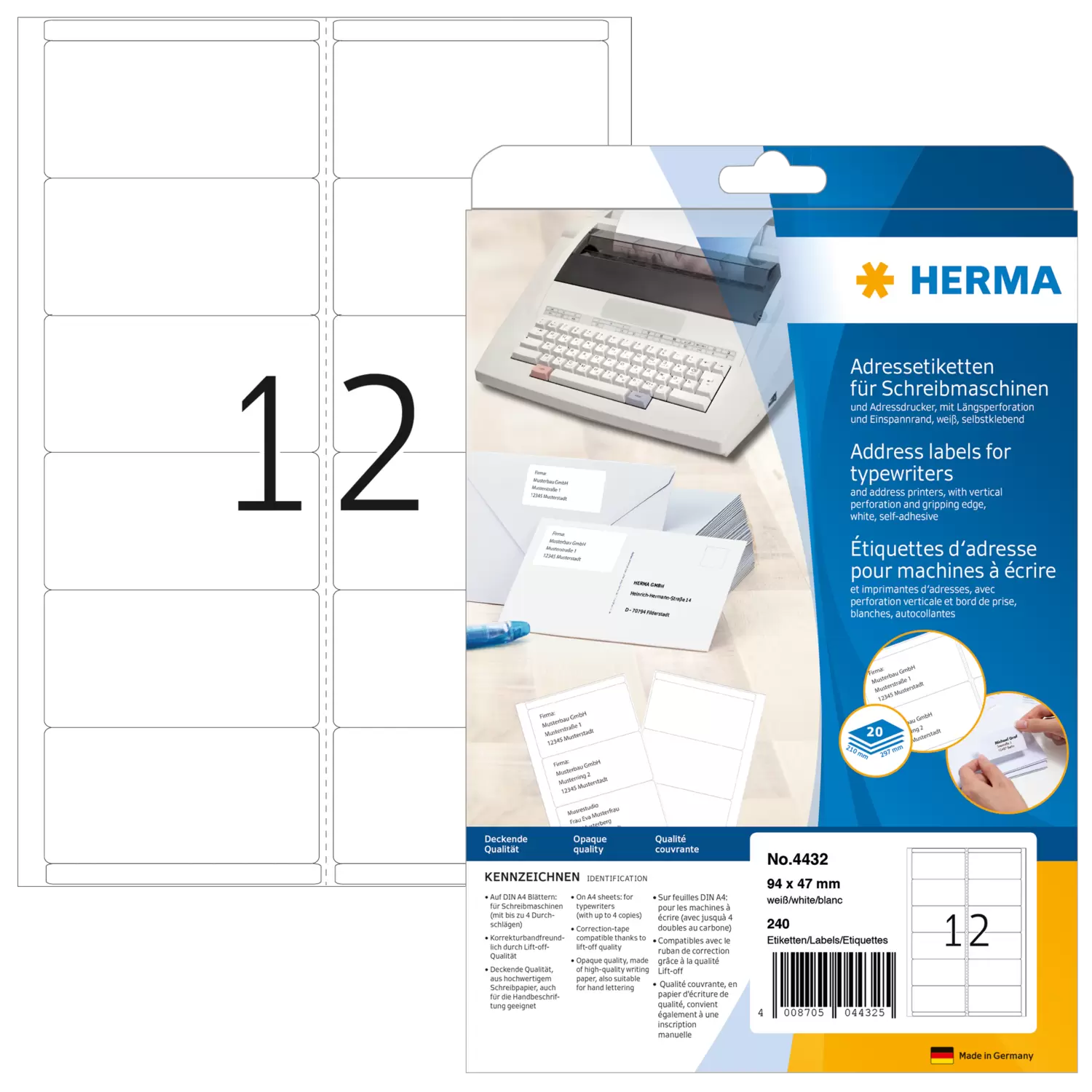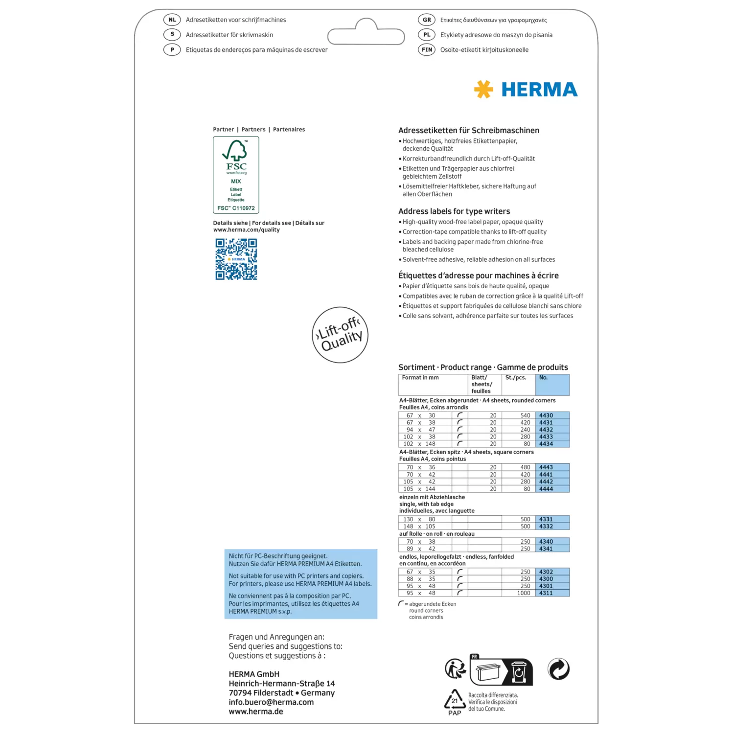 Address labels for typewriters, on A4 sheets, with round corners. To address, for labelling of files, shelves, containers, to stick over or as text sticker for patterns, photos etc. Made of high-quality, wood-free white paper, FSC™ Mix Credit certified, chlorine-free bleached, solvent-free adhesive. Vertical perforation for easy separating of the labels. For typewriters or labelling by hand. Not suitable for PC printers. Please use HERMA PREMIUM A4 labels.