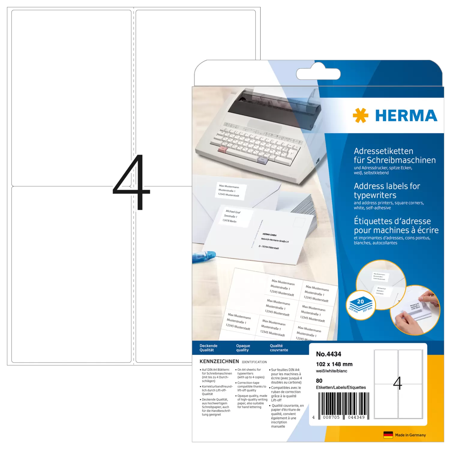 Address labels for typewriters, on A4 sheets, with round corners. To address, for labelling of files, shelves, containers, to stick over or as text sticker for patterns, photos etc. Made of high-quality, wood-free white paper, FSC™ Mix Credit certified, chlorine-free bleached, solvent-free adhesive. Vertical perforation for easy separating of the labels. For typewriters or labelling by hand. Not suitable for PC printers. Please use HERMA PREMIUM A4 labels.