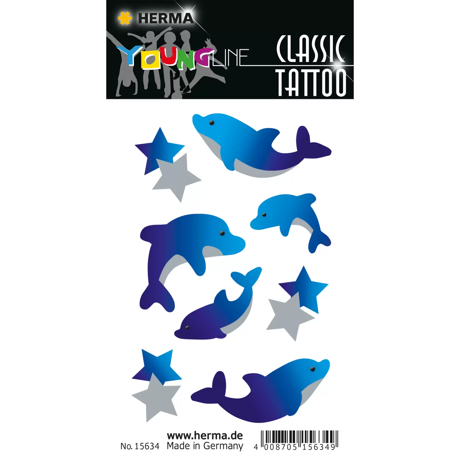 Tattoos don't have to be permanent: adhesive tattoos create imaginative motifs on the skin - but only temporarily. Skin-friendly, easy to apply and even easier to remove: these are the cool adhesive tattoos from HERMA. Cut out the chosen tattoo, peel off the protective film and position on the part of the skin you want, press on firmly with a damp tissue for 30 seconds and peel off - that's all. The tattoos are waterproof and last for several days on the skin. They are also very easy to wash off: just put some skin or cooking oil on a tissue and gently wipe over the tattoo and it will be removed without leaving any residue. Great fun for young and old! The pretty dolphins in blue are a hit as a summer tattoo! Let's go to the swimming pool!