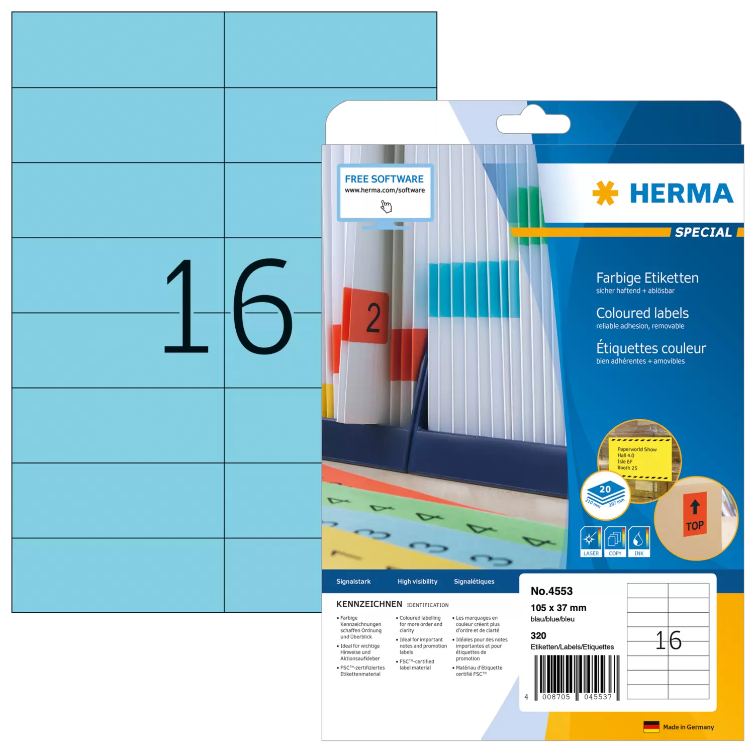 Coloured labels on A4 sheets, self-adhesive. Ideal for labels used as signals, e.g. warning notices, urgent memos, change of address, coloured coding, promotions... Environmentally friendly: FSC™ Mix Credit certified label paper, chlorine-free bleached, solvent-free adhesive. Labels are 100% recyclable, dispose of as for waste paper, packaging made from recycled cardboard. Excellent printing results on all laser printers, inkjet printers, copiers, colour laser printers and colour copiers. Trouble-free processing thanks to all-round protective edge and optimum flatness. Free software solutions: www.herma.com/software.