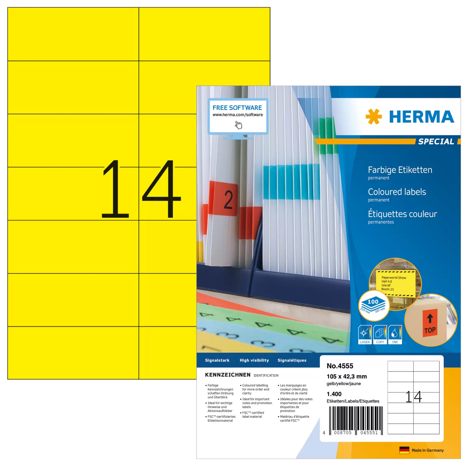 Coloured labels on A4 sheets, self-adhesive. Ideal for labels used as signals, e.g. warning notices, urgent memos, change of address, coloured coding, promotions... Environmentally friendly: FSC™ Mix Credit certified label paper, chlorine-free bleached, solvent-free adhesive. Labels are 100% recyclable, dispose of as for waste paper, packaging made from recycled cardboard. Excellent printing results on all laser printers, inkjet printers, copiers, colour laser printers and colour copiers. Trouble-free processing thanks to all-round protective edge and optimum flatness. Free software solutions: www.herma.com/software.