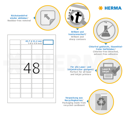 Coloured labels on A4 sheets, self-adhesive. Ideal for labels used as signals, e.g. warning notices, urgent memos, change of address, coloured coding, promotions... Environmentally friendly: FSC™ Mix Credit certified label paper, chlorine-free bleached, solvent-free adhesive. Labels are 100% recyclable, dispose of as for waste paper, packaging made from recycled cardboard. Excellent printing results on all laser printers, inkjet printers, copiers, colour laser printers and colour copiers. Trouble-free processing thanks to all-round protective edge and optimum flatness. Free software solutions: www.herma.com/software.