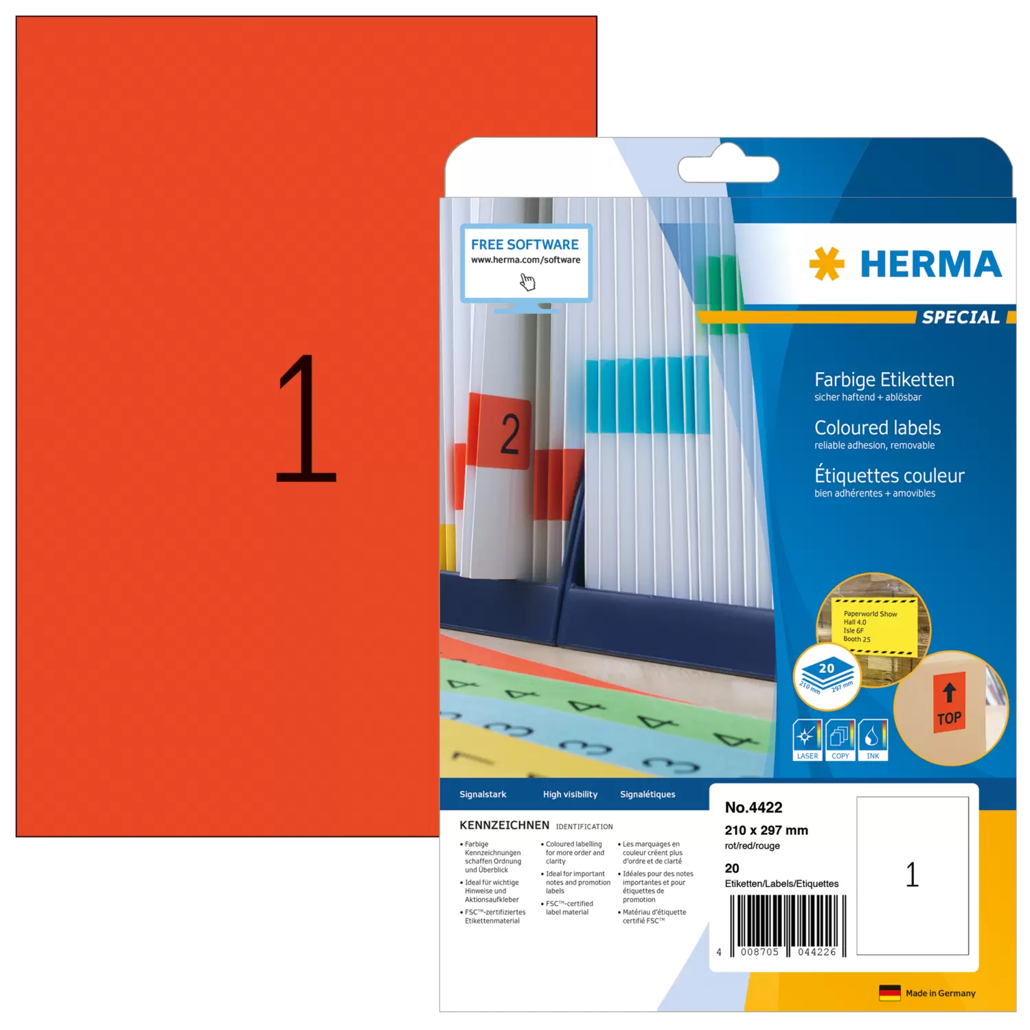 Coloured labels on A4 sheets, self-adhesive. Ideal for labels used as signals, e.g. warning notices, urgent memos, change of address, coloured coding, promotions... Environmentally friendly: FSC™ Mix Credit certified label paper, chlorine-free bleached, solvent-free adhesive. Labels are 100% recyclable, dispose of as for waste paper, packaging made from recycled cardboard. Excellent printing results on all laser printers, inkjet printers, copiers, colour laser printers and colour copiers. Trouble-free processing thanks to all-round protective edge and optimum flatness. Free software solutions: www.herma.com/software.