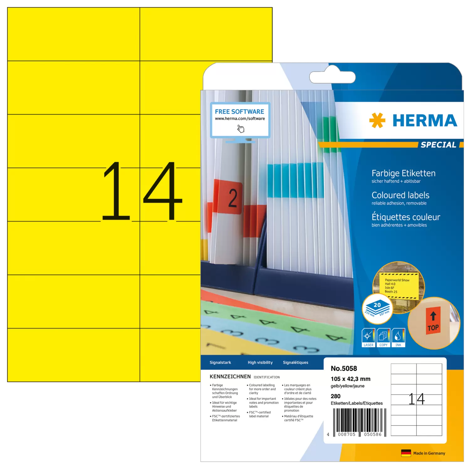 Coloured labels A4, 105 x 42,3 mm, yellow, removable