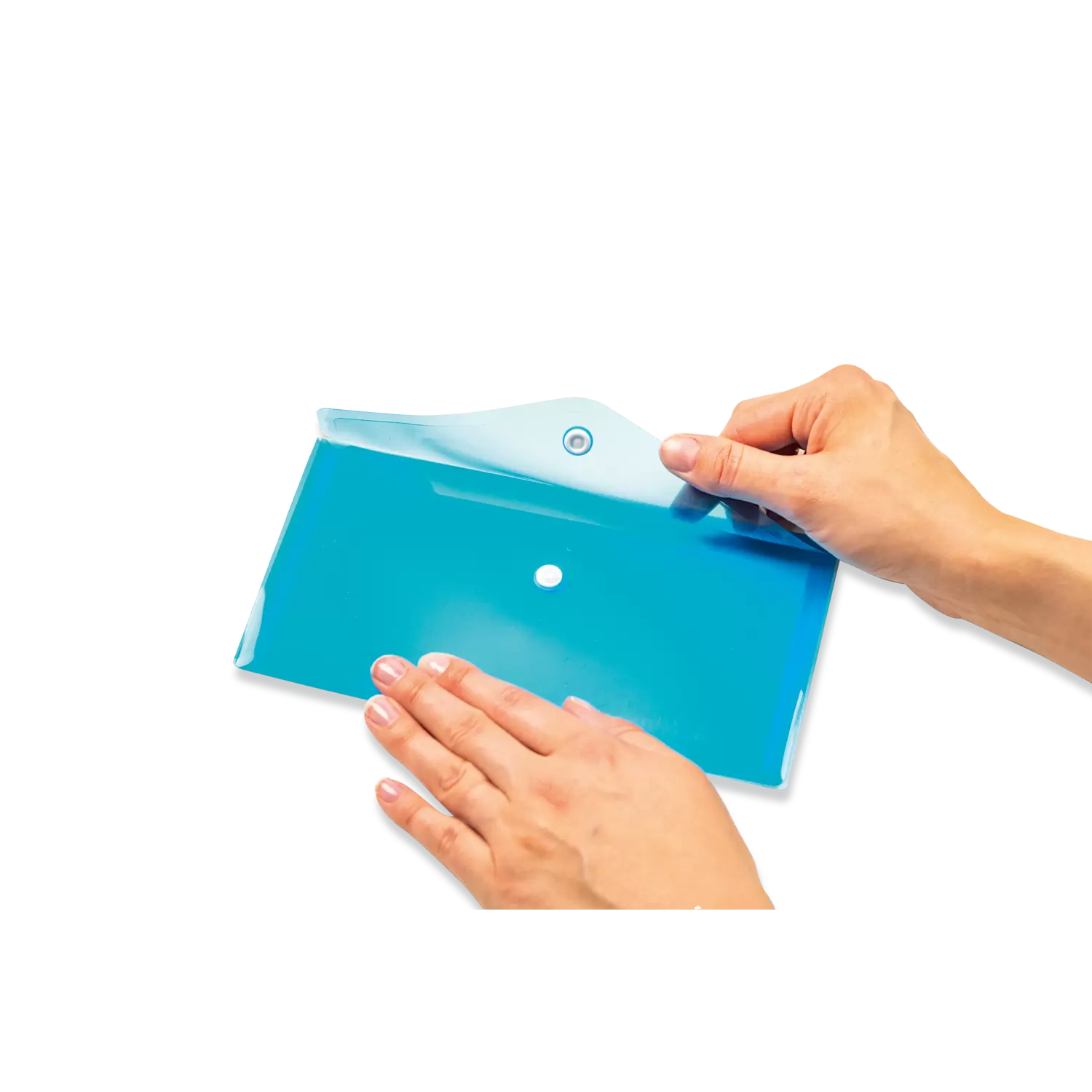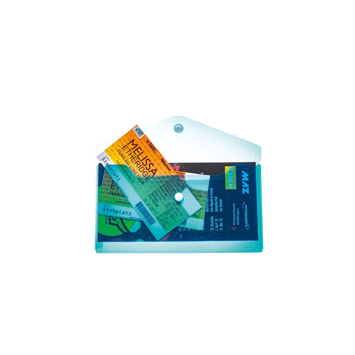 The practical HERMA Document Bag in DIN long format (22 x 12 cm) in light blue is the multifunctional organiser for on the go, at home, at work, at school and much more. The handy folder is made of sturdy transparent polypropylene and is therefore resistant to dirt and moisture. Receipts, letters, travel documents, drawings or smaller utensils stay neat and tidy.