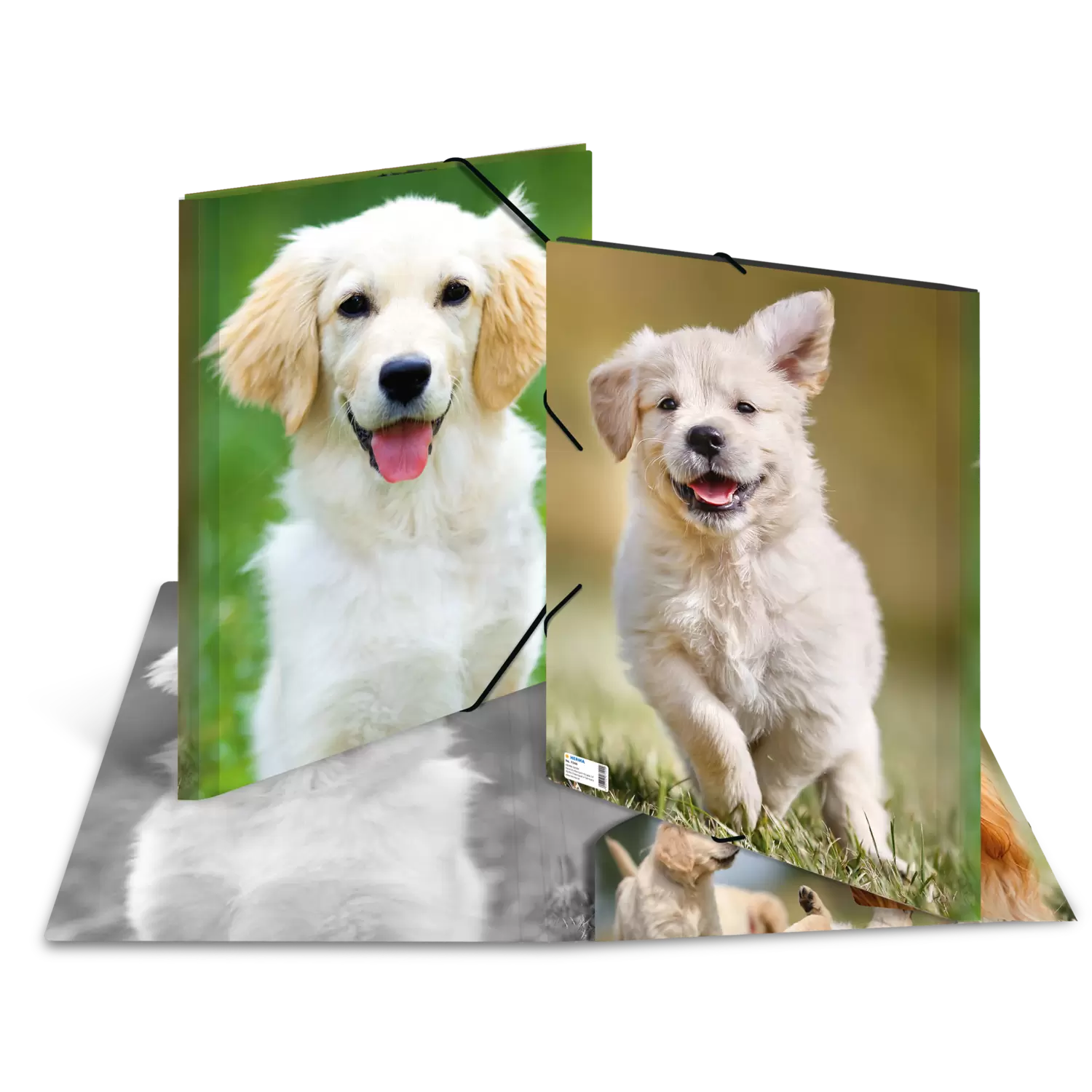 Elasticated folder with elastic straß and 3 printed flaps. Made of sturdy polypropylene, size A3. Ideal for storing loose papers. Available in design dogs.