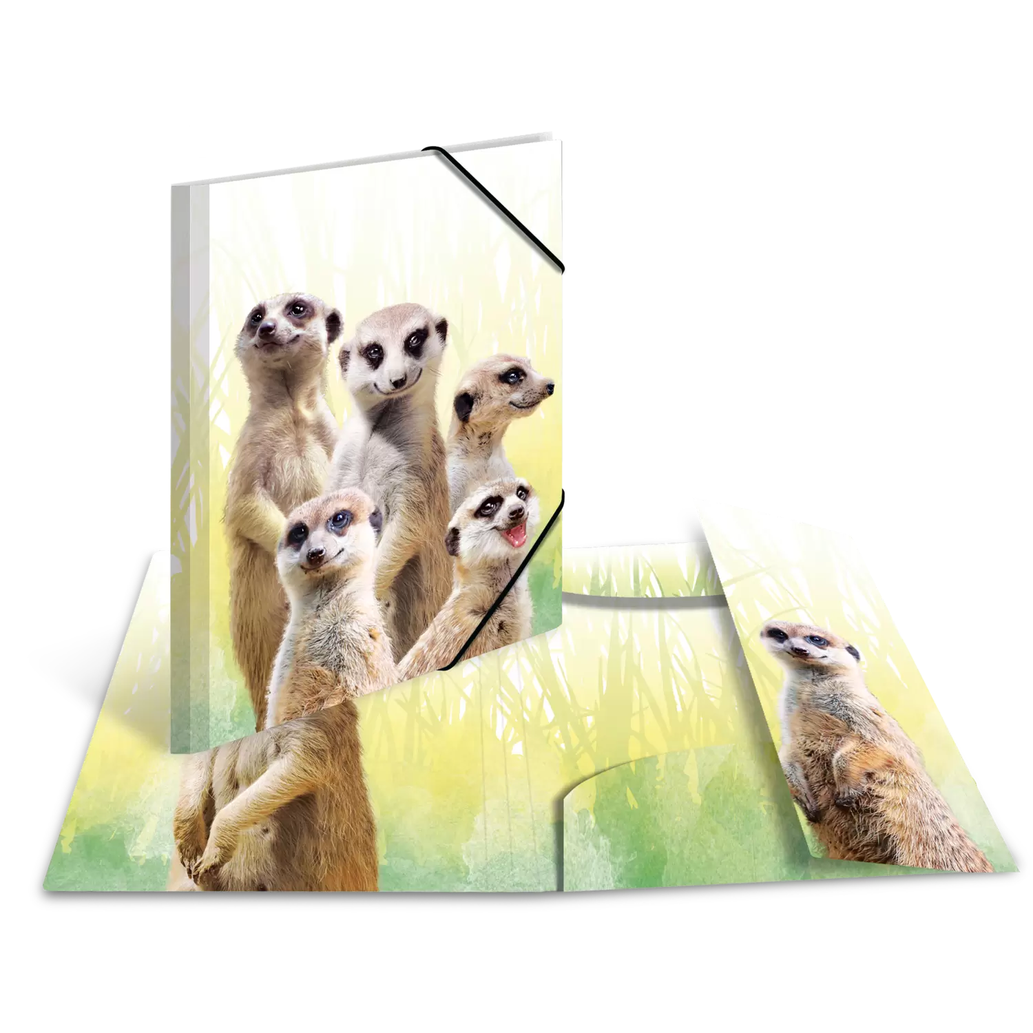 The animal motif folder Meerkat Troop by HERMA, with coloured inner print, is ideal for all animal lovers who want to combine order and appearance. The folder has a plain background with fur pattern. Attentively they look at you, the meerkat gang, the team workers with perfect job sharing. Together with 4 other animal motifs, the folder belongs to the Exotic Animal series, which is guaranteed to put you in a good mood and offers everything that pupils and students need to store important documents and artworks easily and quickly. Equipped with high-quality corner straps, it holds the content together so that it cannot fall out and get lost. Papers are also optimally protected against dirt, grime and other external influences, as the HERMA elasticated folder has three integrated interior flaps. It is also extremely hard-wearing and wipeable. Made of sturdy polypropylene, the folder helps keeping things tidy and provides an overview of a wide range of documents. Further motifs of the series are the Giraffe Friends, the Koala Family, the Tropical Clique and the Monkey Gang. It has a size of 440 mm x 335 mm, so that pictures, documents and drawings up to a size of A3 can be stored neatly. The special feature of the folders is the inner print with a motif matching the outside. For smaller artworks, letters, notes and documents, the assortment is also available in A4 format with the same motifs.