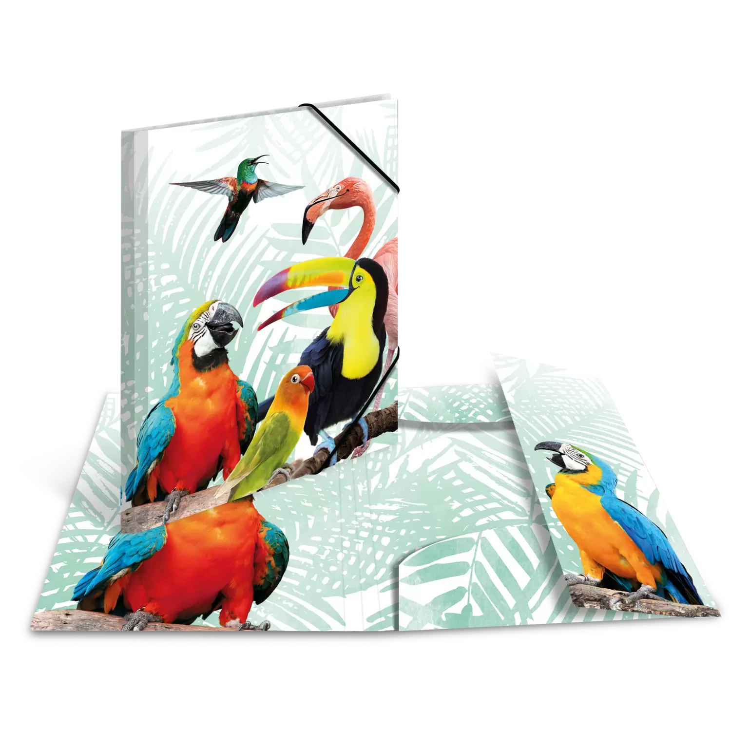 The animal motif folder Tropical Clique by HERMA, with coloured inner print, is ideal for all animal lovers who want to combine order and appearance. The folder has a plain background with fur pattern. The colourful, loudly and cheerfully chattering Tropical Clique spreads good mood and holiday feeling. Together with 4 other animal motifs, the folder belongs to the Exotic Animal series, which is guaranteed to put you in a good mood and offers everything that pupils and students need to store important documents and artworks easily and quickly. Equipped with high-quality corner straps, it holds the content together so that it cannot fall out and get lost. Papers are also optimally protected against dirt, grime and other external influences, as the HERMA elasticated folder has three integrated interior flaps. It is also extremely hard-wearing and wipeable. Made of sturdy polypropylene, the folder helps keeping things tidy and provides an overview of a wide range of documents. Further motifs of the series are the Giraffe Friends, the Koala Family, the Monkey Gang and the Meerkat Troop. It has a size of 440 mm x 335 mm, so that pictures, documents and drawings up to a size of A3 can be stored neatly. The special feature of the folders is the inner print with a motif matching the outside. For smaller ar tworks, letters, notes and documents, the assortment is also available in A4 format with the same motifs.