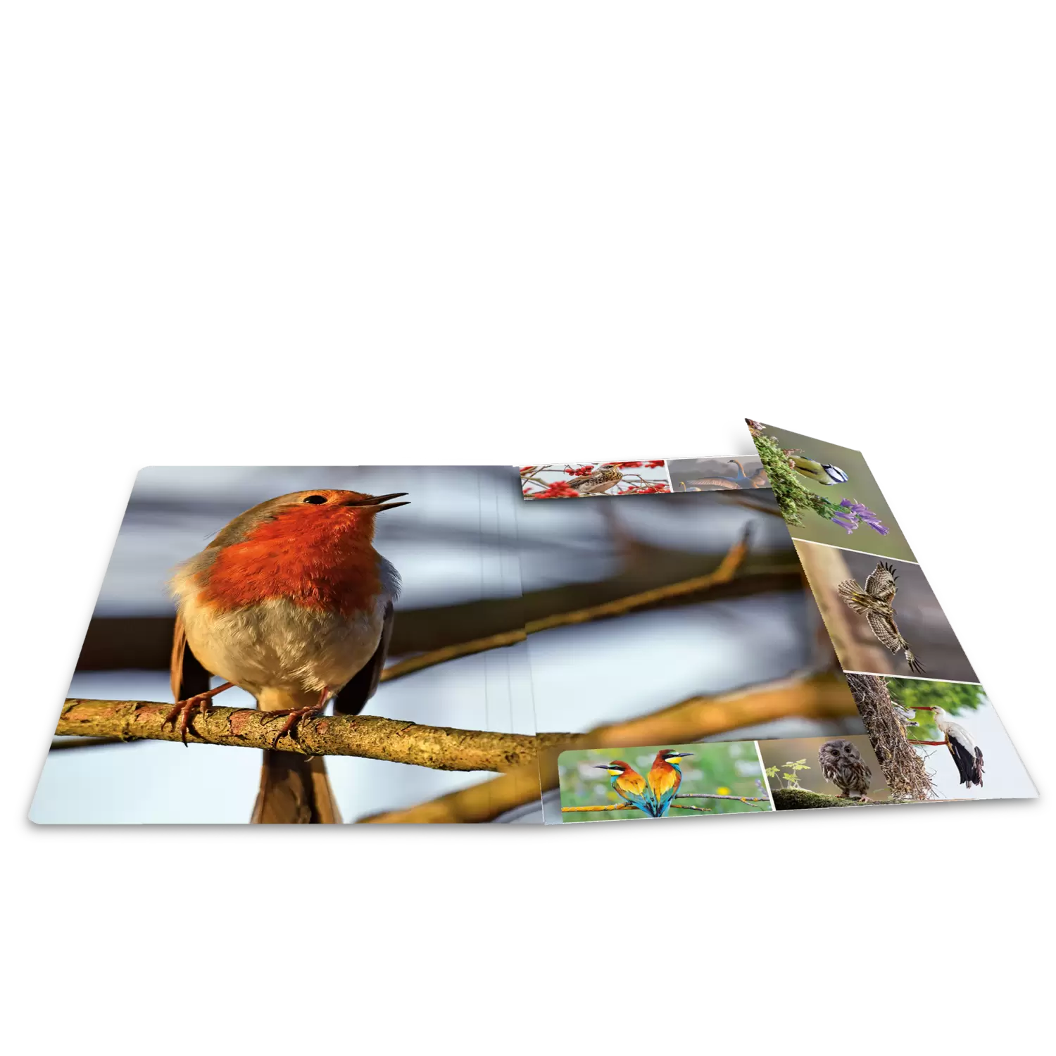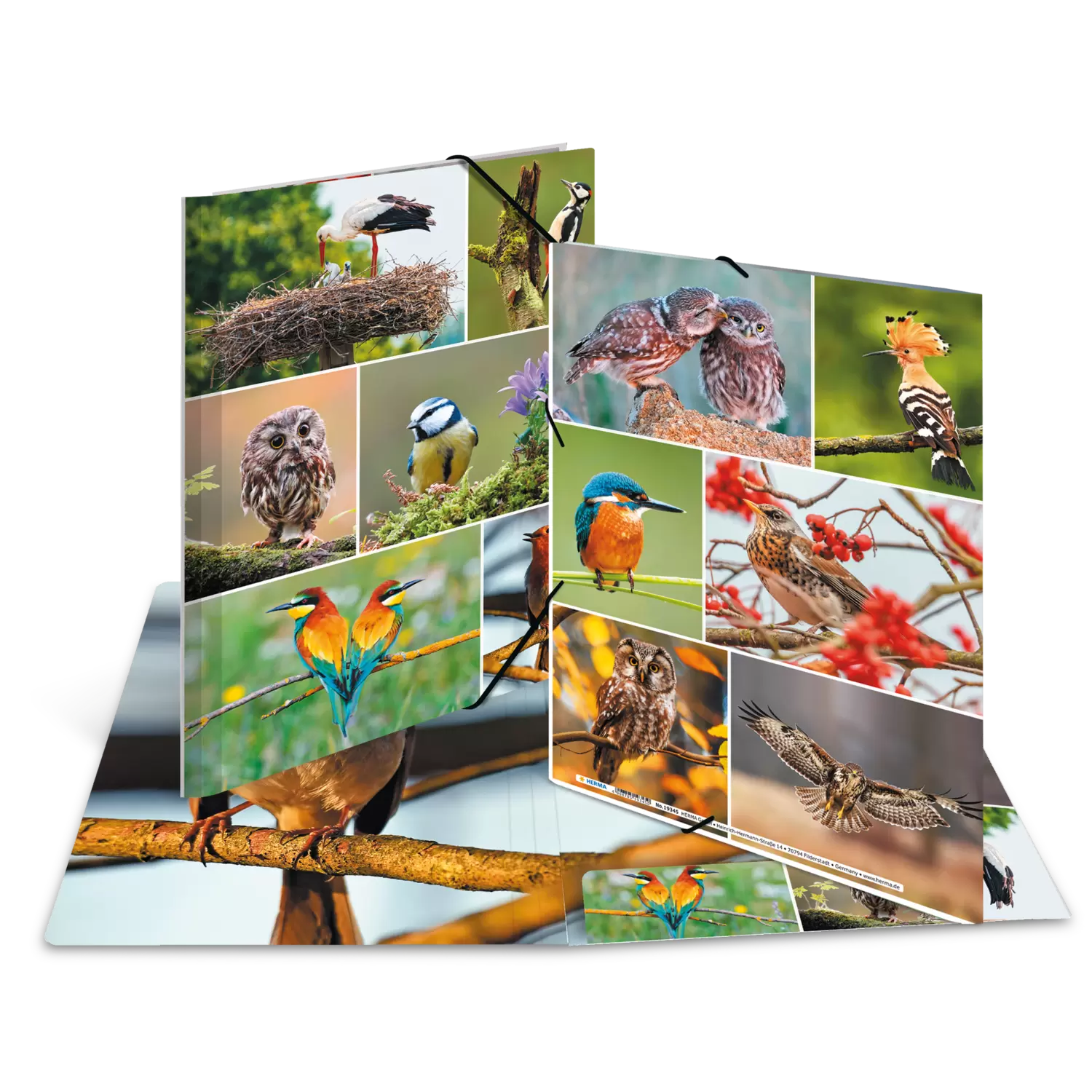 Watch out, bird friends! Anyone who is enthusiastic about birds and likes to spend their time with binoculars birdwatching in nature, in the forest, on meadows, pastures and fields, will have a great time with this folder, which is printed inside and outside with many different bird photographs. The folder measures 32 cm x 24 cm and is therefore large enough for papers, drawings and documents up to A4 size. It is made of sturdy cardboard and can be easily opened and closed with two high-quality corner straps. The three interior flaps protect the contents and even smaller documents cannot fall out.