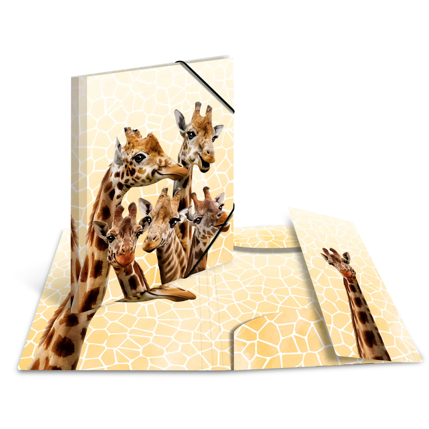 The animal motif folder Giraffe Friends by HERMA, with coloured inner print, is ideal for all animal lovers who want to combine order and appearance. The folder has a plain background with fur pattern, so that the giraffes with their beautiful eyes and long eyelashes stand out as real eye-catchers. Together with 4 other animal motifs, the folder belongs to the Exotic Animal series, which is guaranteed to put you in a good mood and offers everything that pupils and students need to store important documents and artworks easily and quickly. Equipped with high-quality corner straps, it holds the content together so that it cannot fall out and get lost. Papers are also optimally protected against dirt, grime and other external influences, as the HERMA elasticated folder has three integrated interior flaps. It is also extremely hard-wearing and wipeable. Made of sturdy polypropylene, the folder helps keeping things tidy and provides an overview of a wide range of documents. Thanks to its size, the folder can be easily transported home from work or school as it fits easily into a rucksack, school bag or briefcase. Further motifs of the series are the Koala Family, the Tropical Clique, the Monkey Gang and the Meerkat Troop. It has a size of 320 mm x 240 mm, so that pictures, documents and drawings up to a size of A4 can be stored neatly. The special feature of the folders is the inner print with a motif matching the outside. For larger artworks and documents, the assortment is also available in A3 format with the same motifs.