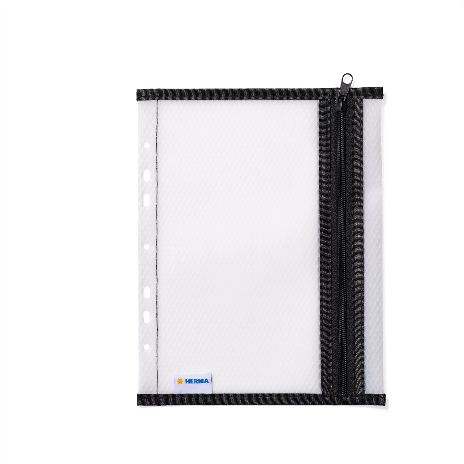 The HERMA Folder Bag in black in A5 format with zipper and Euro perforation can be filed into files or ring binders and offers enough space for everything that needs to be filed but cannot be perforated. CDs, DVDs, pens, markers, calculators, charging cables, sales slips and receipts are stored safely and neatly. The sturdy, mesh-reinforced, transparent foil allows a clear view of the contents and provides perfect protection against dirt, grime and moisture. The material is especially durable and abrasion-resistant.