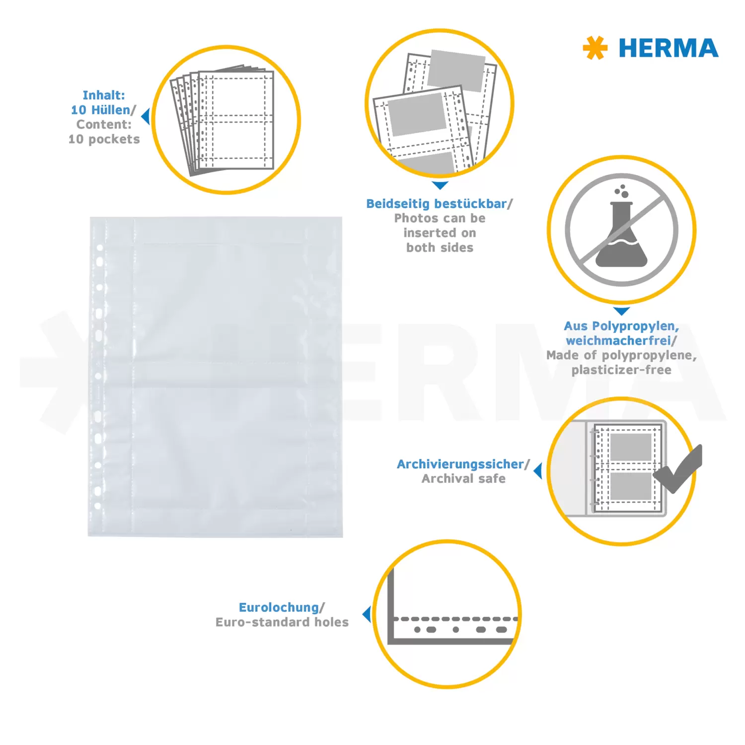 HERMA Fotophan photo pockets are practical organizer and storage aids for photos, pictures, postcards, tickets and much more. Simply insert them into the transparent pockets and everything is safely stowed away - uncomplicated and completely without any sticking! The photo pockets are made of sturdy white polypropylene, with clear-transparent pockets welded on both sides for photos up to 10 x 15 cm in landscape format. This way, 4 photos per pocket can be stored safely and securely. The pockets are absolutely plasticizer-free and archival safe, with no chemical effects on the photos. Each package contains 250 pockets with space for 1,000 photos. Thanks to the practical Euro perforation, they can be filed into all standard files, albums and ring binders for A4 formats. Ideal are the HERMA Fotobooks, which are available in 5 great colours. Perfect protection, completely without dirt, creases or fingerprints.