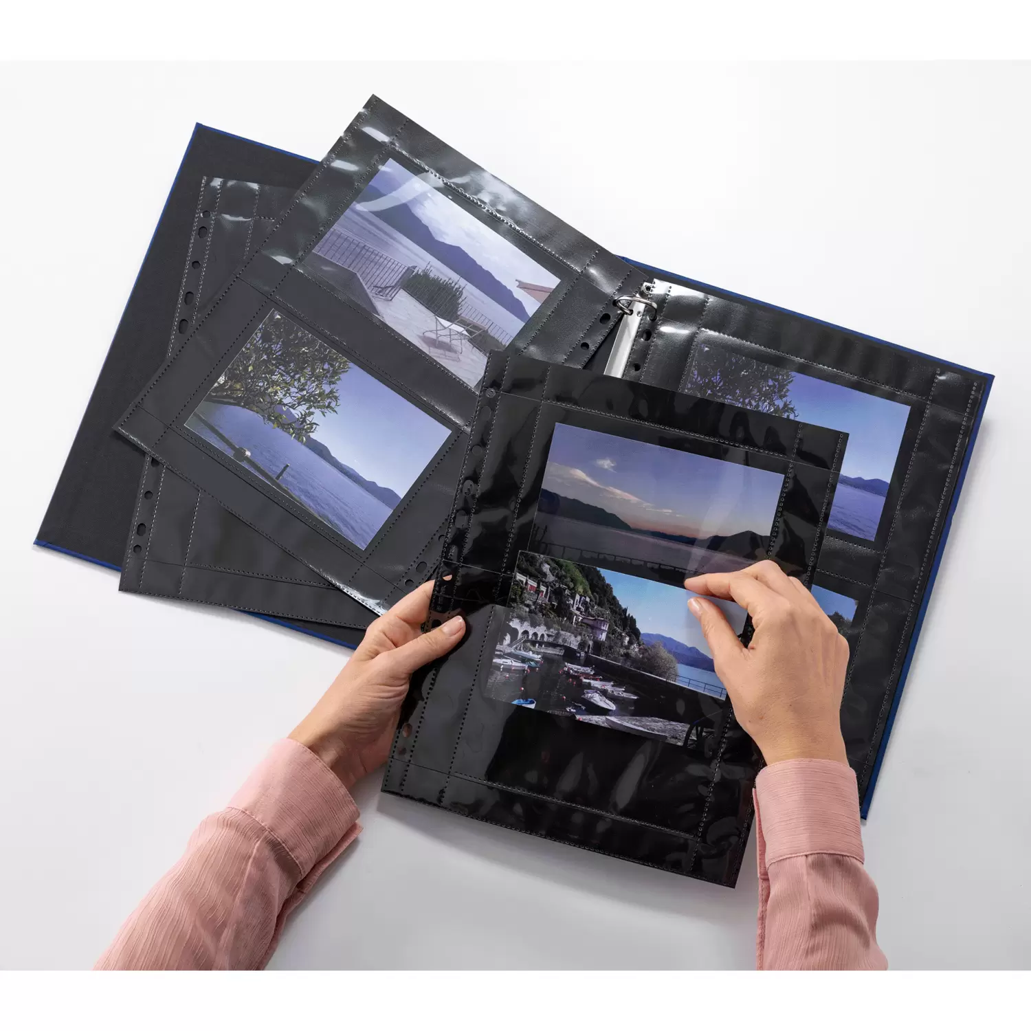 HERMA Fotophan photo pockets are practical organizer and storage aids for photos, pictures, postcards, tickets and much more. Simply insert them into the transparent pockets and everything is safely stowed away - uncomplicated and completely without any sticking! The photo pockets are made of sturdy black polypropylene, with clear-transparent pockets welded on both sides for photos up to 10 x 15 cm in landscape format. This way, 4 photos per pocket can be stored safely and securely. The pockets are absolutely plasticizer-free and archival safe, with no chemical effects on the photos. Thanks to the practical Euro perforation, they can be filed into all standard files, albums and ring binders for A4 formats. Ideal are the HERMA Fotobooks, which are available in 5 great colours. Perfect protection, completely without dirt, creases or fingerprints.