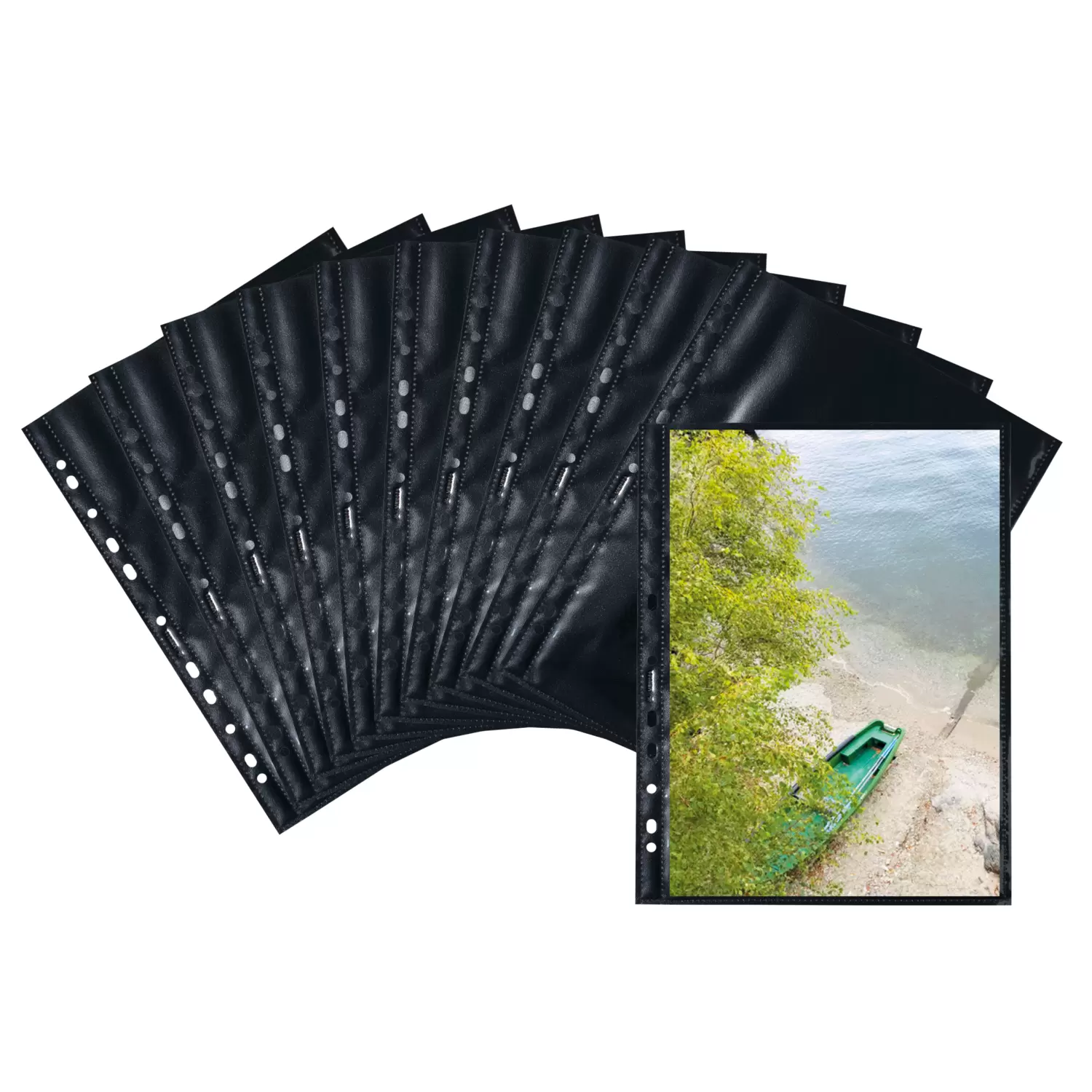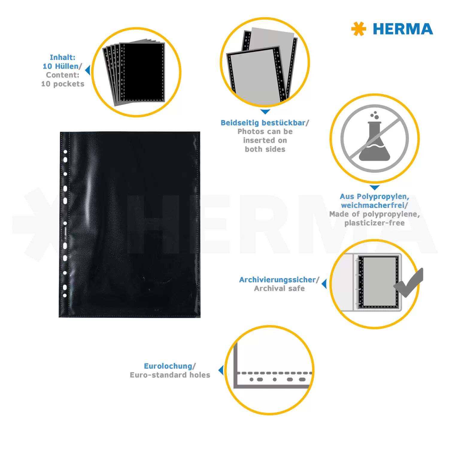 HERMA Fotophan photo pockets are practical organizer and storage aids for photos, pictures, postcards, tickets and much more. Simply insert them into the transparent pockets and everything is safely stowed away - uncomplicated and completely without any sticking! The photo pockets are made of sturdy black polypropylene, with clear-transparent pockets welded on both sides for photos up to 20 x 30 cm. This way, 2 photos per pocket can be stored safely and securely. The pockets are absolutely plasticizer-free and archival safe, with no chemical effects on the photos. Each package contains 10 pockets with space for 20 photos. Thanks to the practical Euro perforation, they can be filed into all standard files, albums and ring binders for A4 formats. Ideal are the HERMA Fotobooks, which are available in 5 great colours. Perfect protection, completely without dirt, creases or fingerprints.