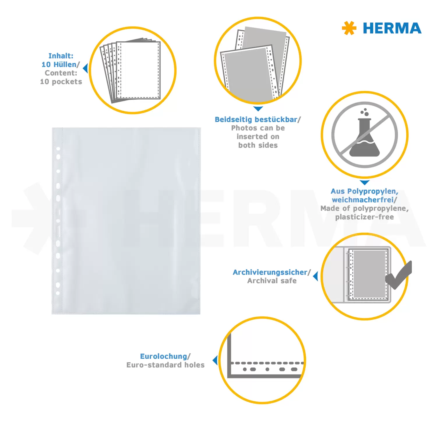 HERMA Fotophan photo pockets are practical organizer and storage aids for photos, pictures, postcards, tickets and much more. Simply insert them into the transparent pockets and everything is safely stowed away - uncomplicated and completely without any sticking! The photo pockets are made of sturdy white polypropylene, with clear-transparent pockets welded on both sides for photos up to 20 x 30 cm. This way, 2 photos per pocket can be stored safely and securely. The pockets are absolutely plasticizer-free and archival safe, with no chemical effects on the photos. Each package contains 10 pockets with space for 20 photos. Thanks to the practical Euro perforation, they can be filed into all standard files, albums and ring binders for A4 formats. Ideal are the HERMA Fotobooks, which are available in 5 great colours. Perfect protection, completely without dirt, creases or fingerprints.