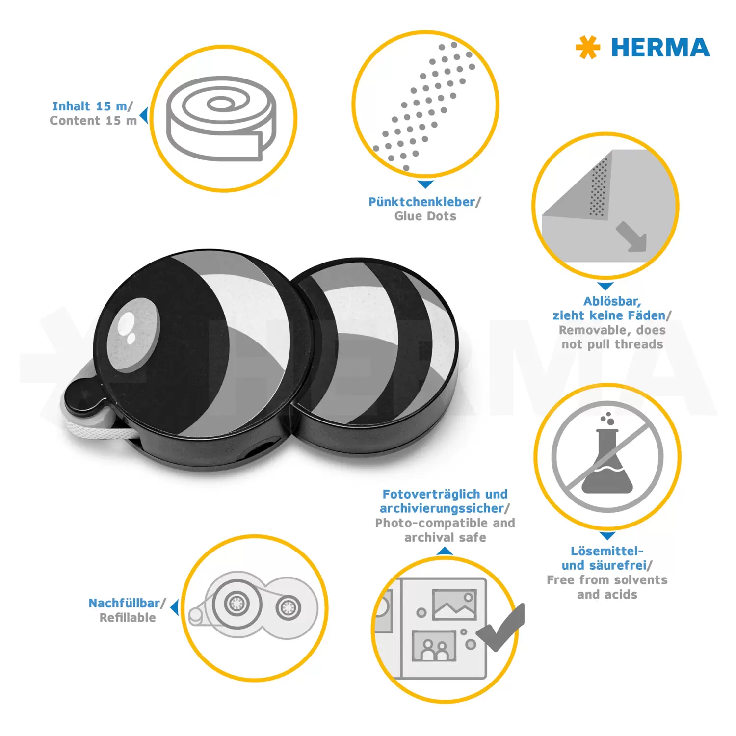 You will find refill rolls for the Glue Bee here: www.herma.co.uk/refill-pack-removable-1061/ Link: www.herma.de/buero-zuhause/produkt/transfer-nachfuellrolle -wieder-abloesbar-15m-1061/