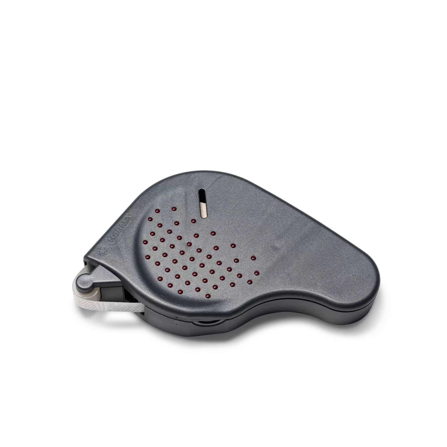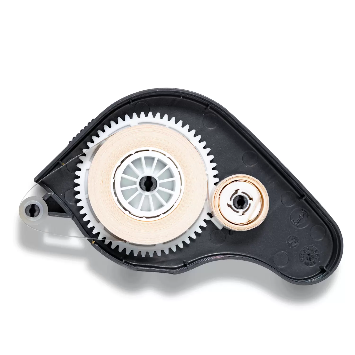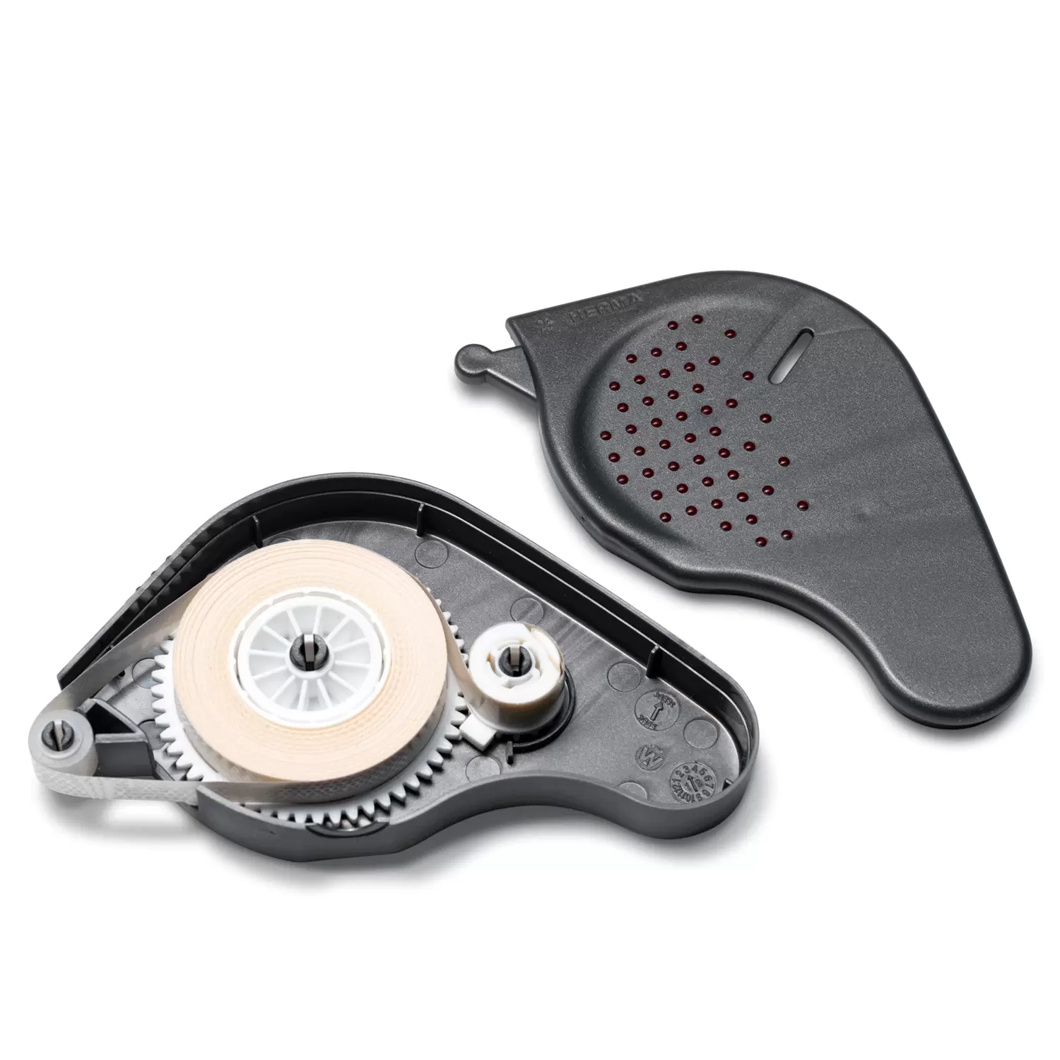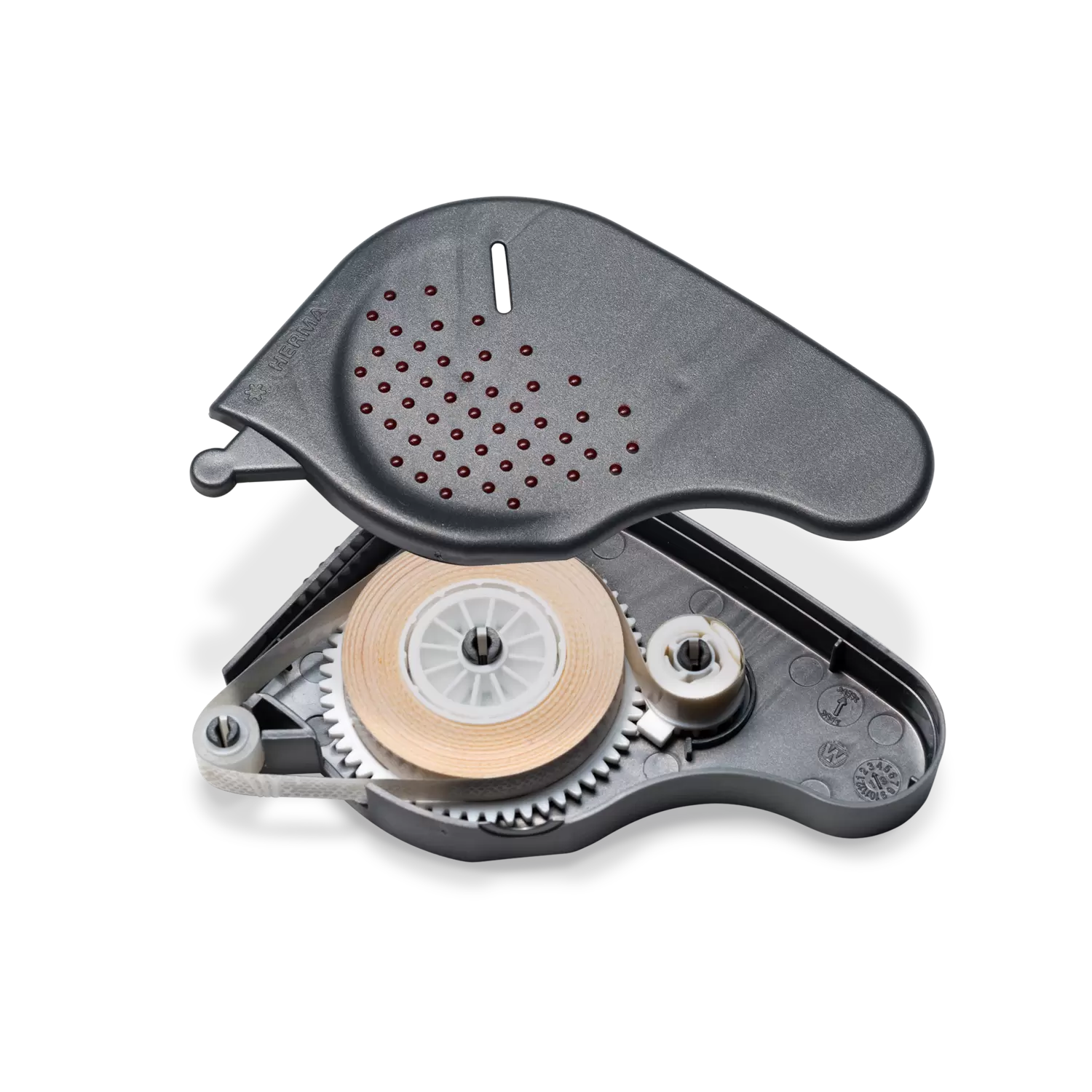 1. Open the glue dispenser. 2. Remove the old roll and insert the new one. 3. Peel the leading edge from the roll and run it upwards past the roller and back to the ratchet wheel. 4. Wrap the end of the strip securely around the ratchet wheel.