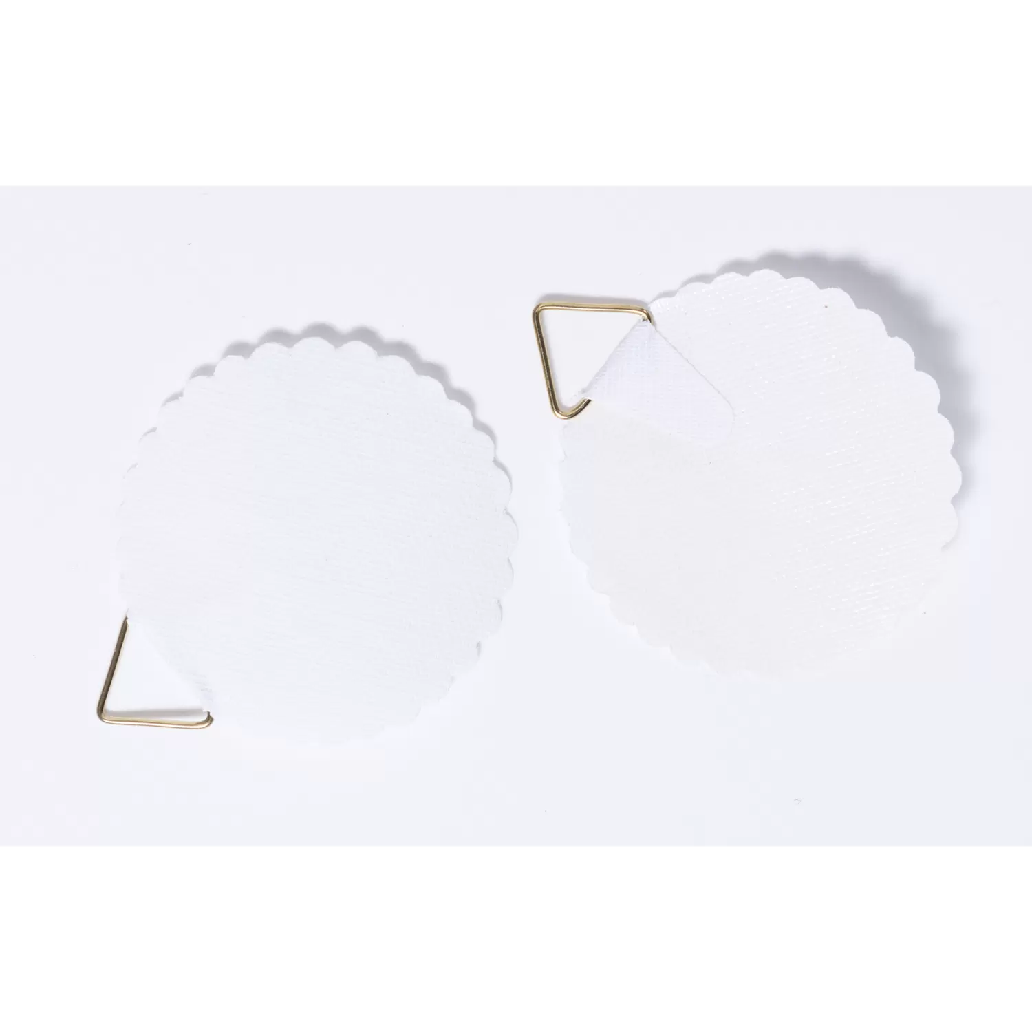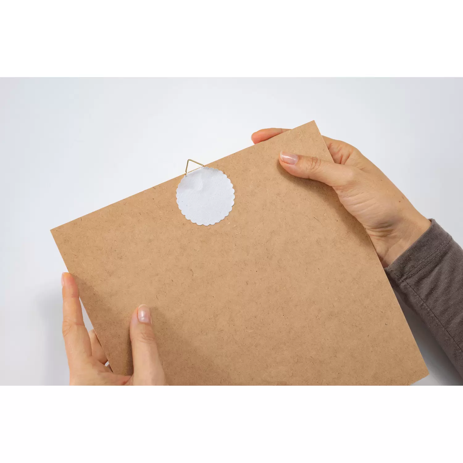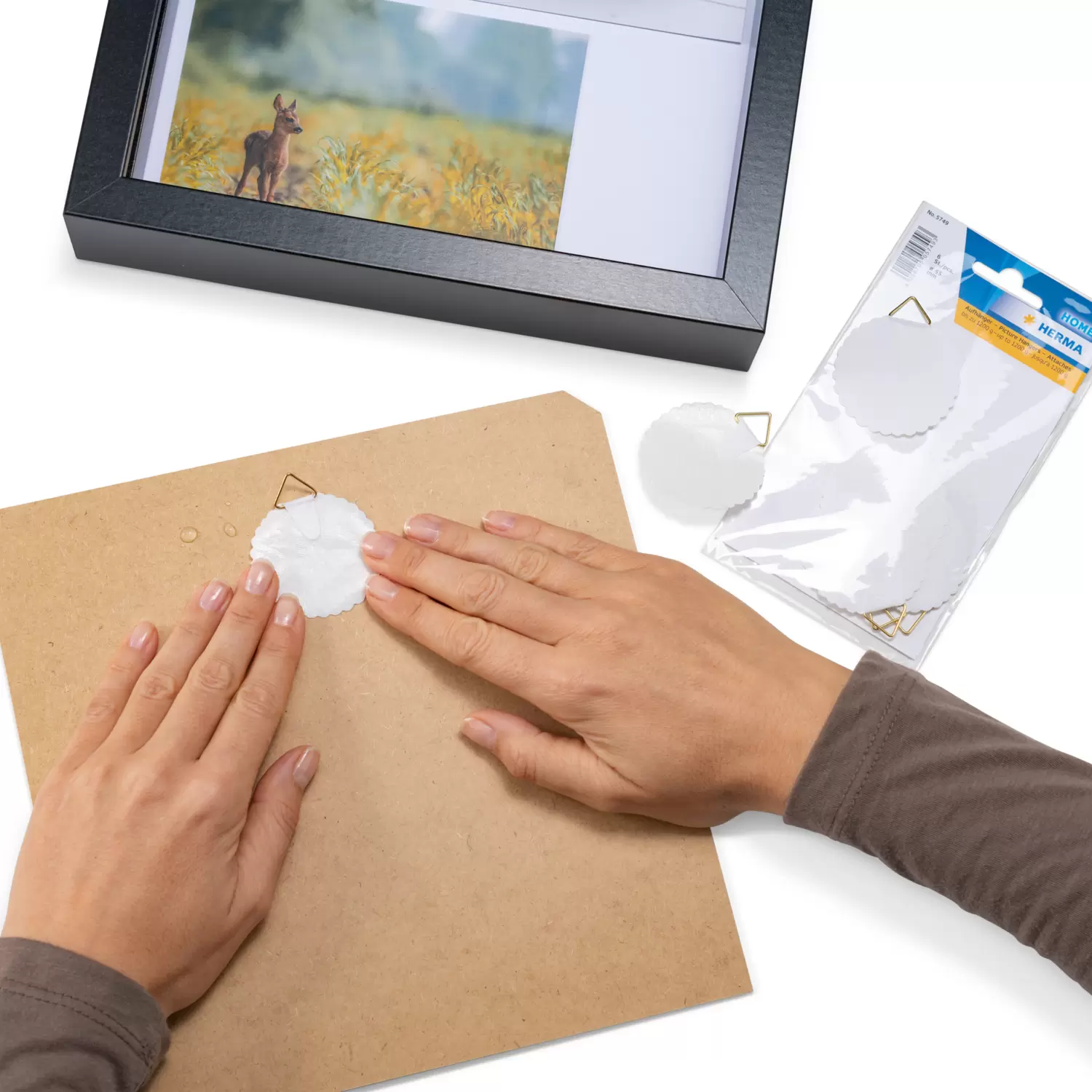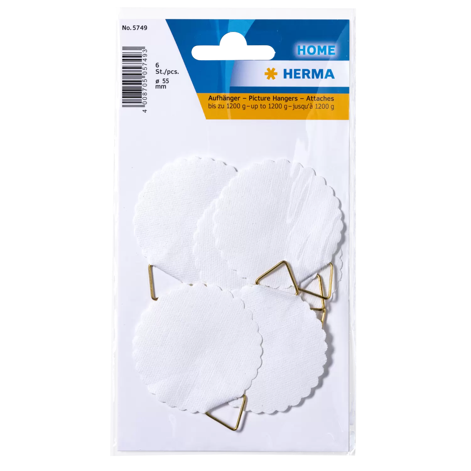 Permanent adhesive, white hangers from HERMA made of sturdy textured linen fabric with integrated wire hook. 6 pieces per pack. For mounting pictures and picture frames, posters, calendars, signs, wall decorations with smooth backs and much more. The hangers have a diameter of 55 mm and hold up to 1.2 kg. Self-adhesive thanks to a water-soluble gummed side: simply moisten one or more hangers, stick them on the grease- and dust-free surface, let them dry for at least 30 minutes and hang up the object. An easy and cheap way to hang or reposition decorative objects and brighten up your home or office. Adheres to smooth surfaces such as wood, cardboard, plastics, glass, porcelain, ceramics and more. Caution: Reduced load capacity on curved surfaces. Does not adhere to hard or soft foam board or laminated surfaces.