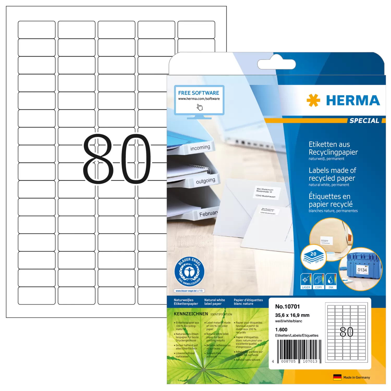 Labels made of recycled paper A4, 35,6 x 16,9 mm, white, permanent adhesion