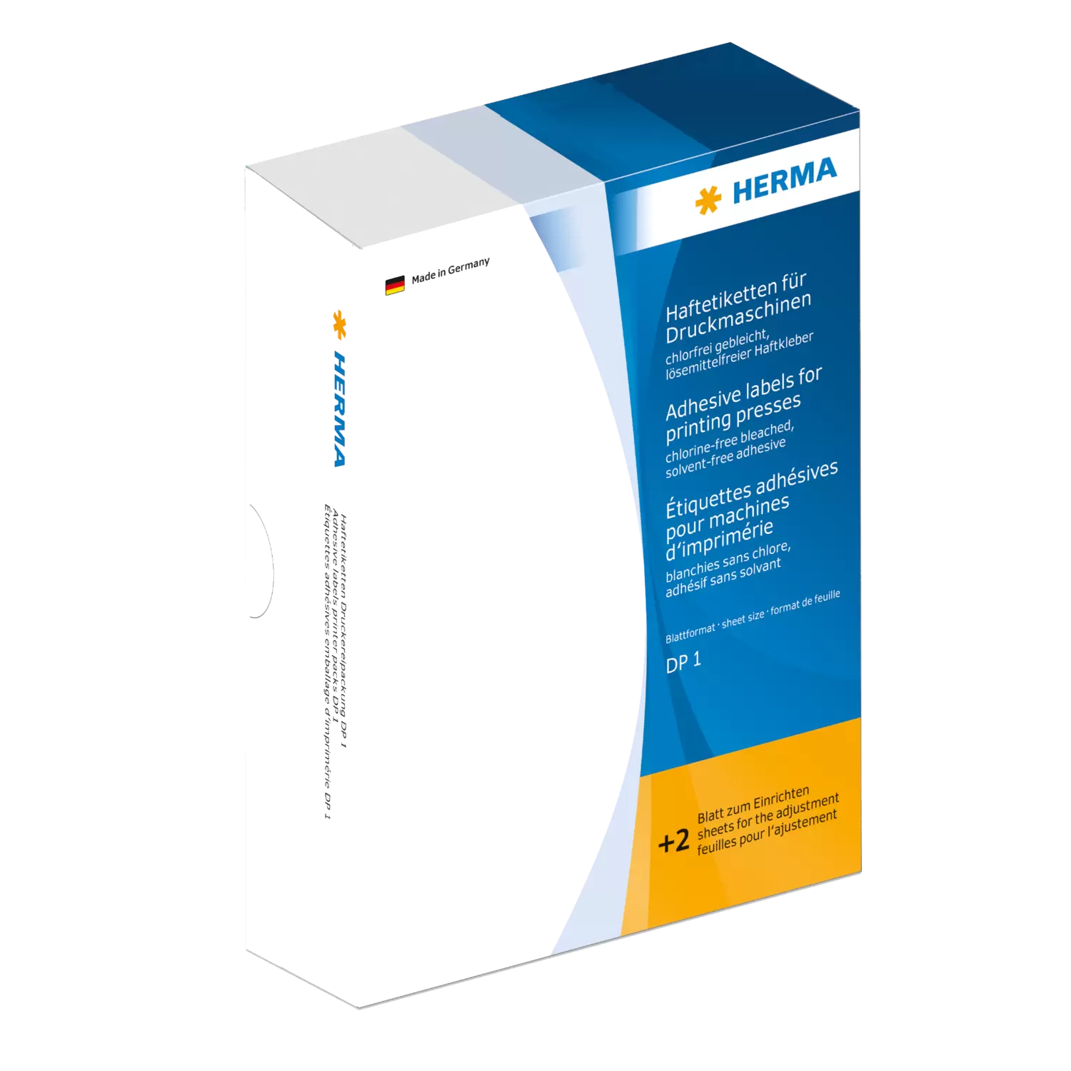 Self-adhesive labels made of wood-free paper (75g/qm) to print on printing presses, chlorine-free bleached, solvent-free adhesive. White labels with FSC™ Mix Credit certification. Rounded corners. Mounted true to register on sheets with gripper and feeder margin. Each pack contains 2 extra sheets for setting-up operations. Format of the sheets 168* x 120 mm (*varies in accordance with label size. The sheet sizes and register, however, are absolutely identical for each type). Not suitable for PC printers. Please use HERMA PREMIUM A4 labels.