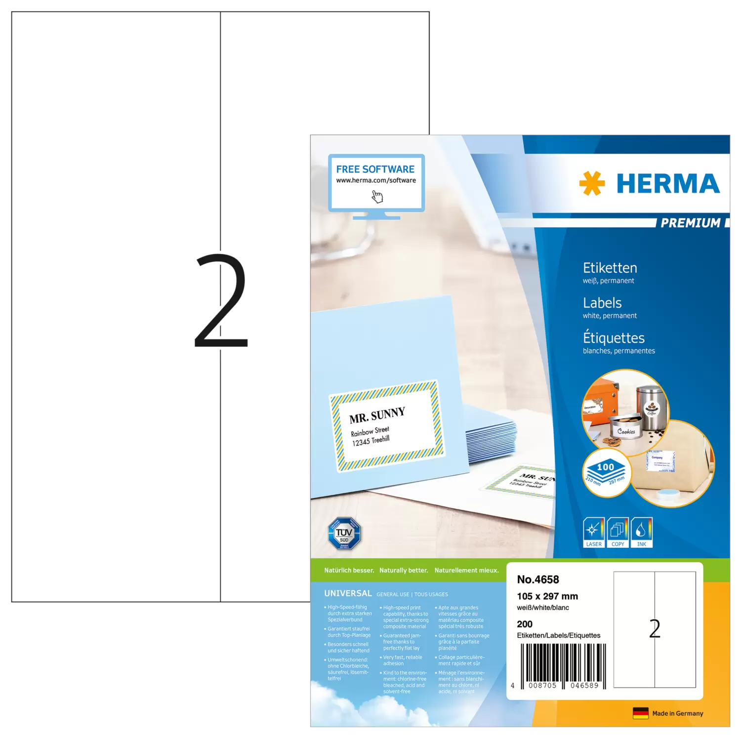 PREMIUM labels A4, 105 x 297 mm, white, permanent adhesion