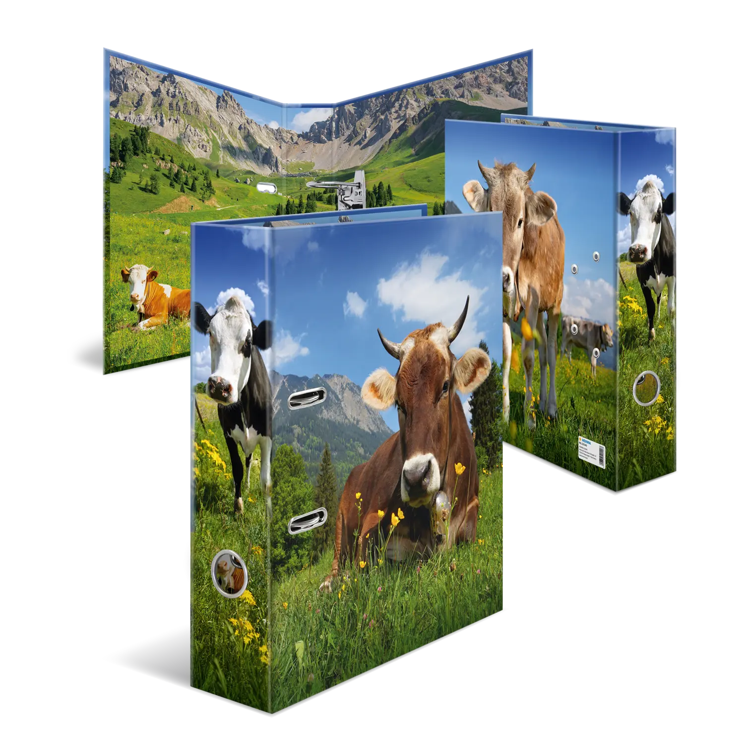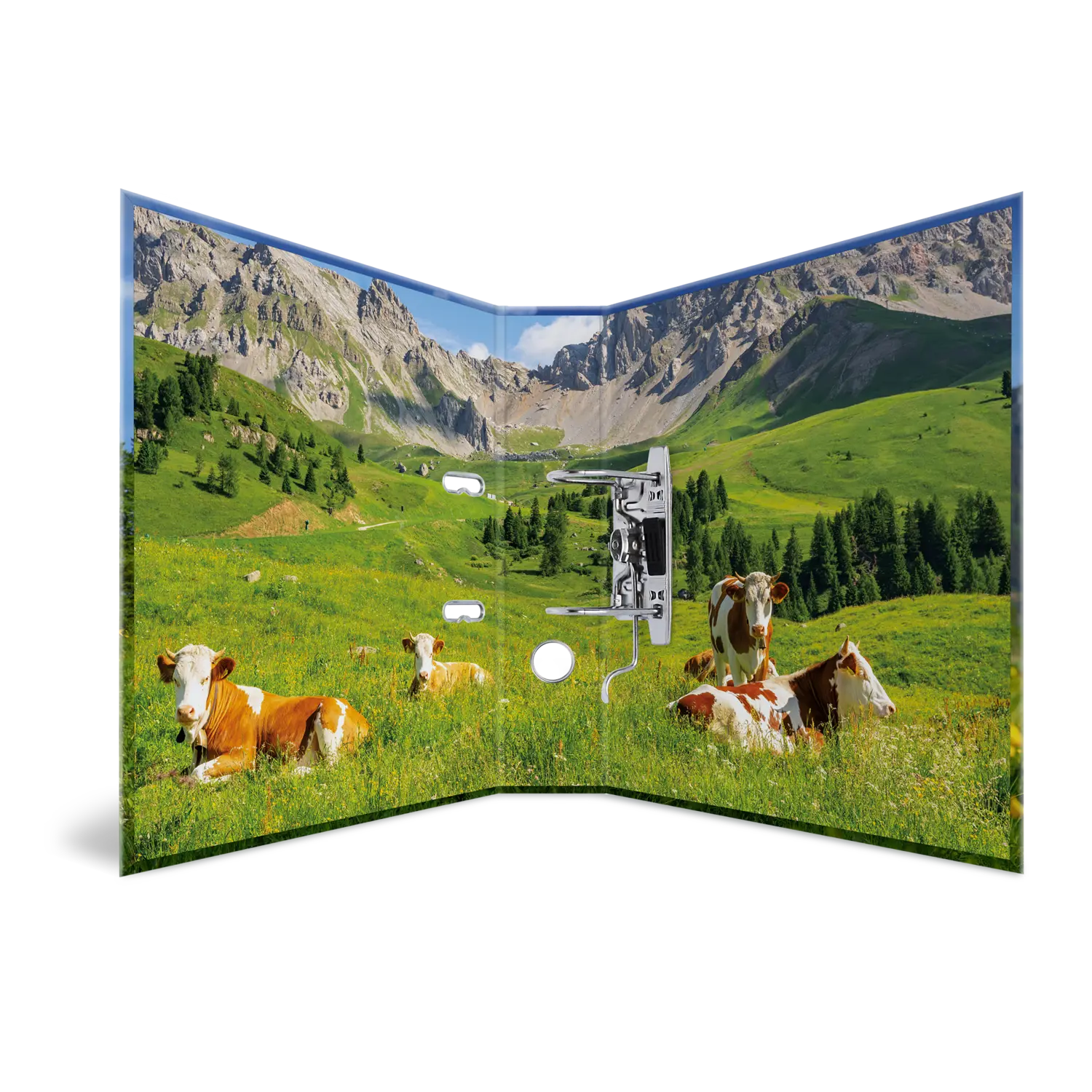 Rural charm for school and office! The "Alpine cow" motif file combines alpine design with high functionality. Cows on lush green alpine meadows against an impressive mountain backdrop give the file a natural, calming aura. Made of sturdy cardboard and equipped with a durable lever arch mechanism, the file offers plenty of space for files, drawings, or documents. A decorative eye-catcher in children's rooms, school bags, or on desks. Ideal for anyone who appreciates rural flair and animal motifs.