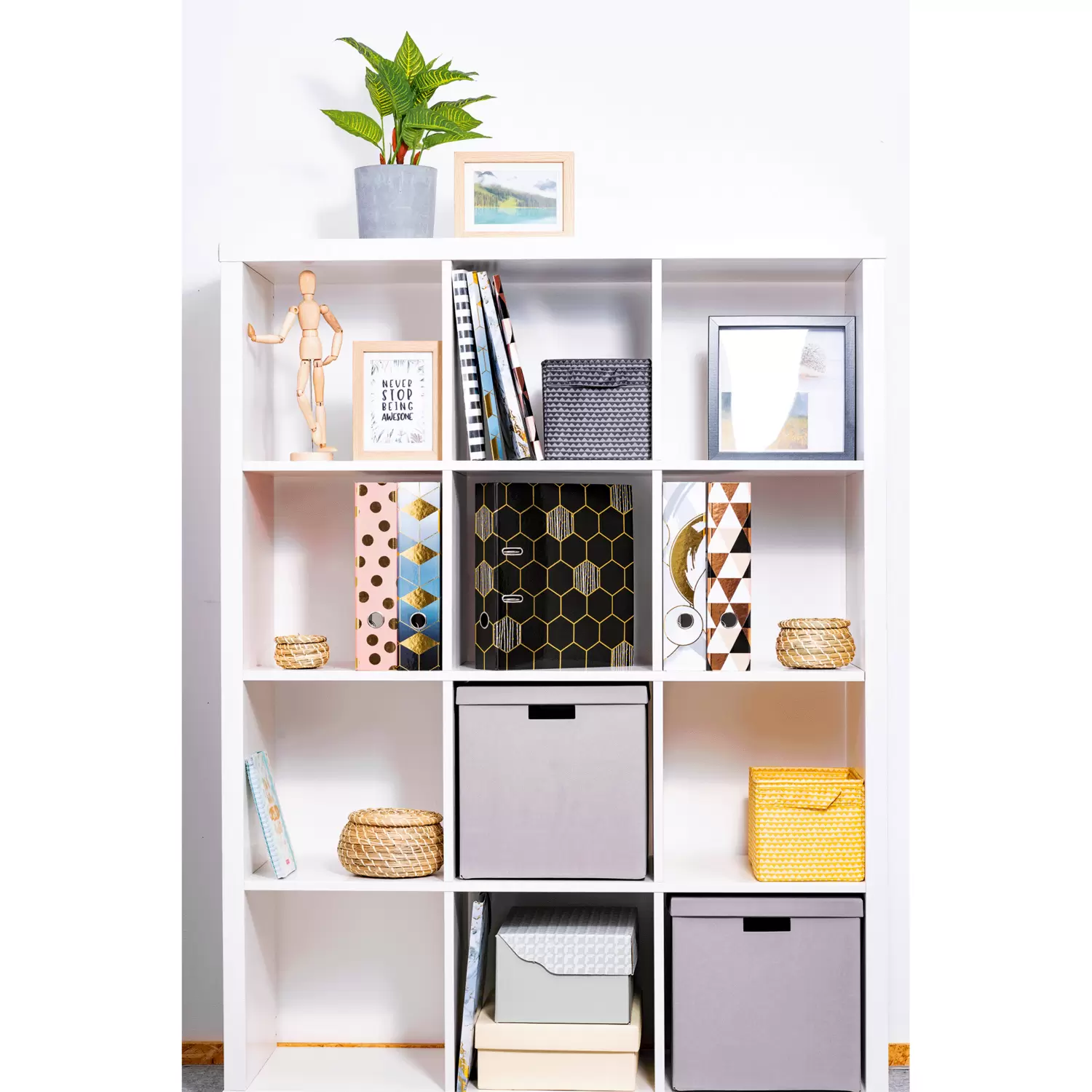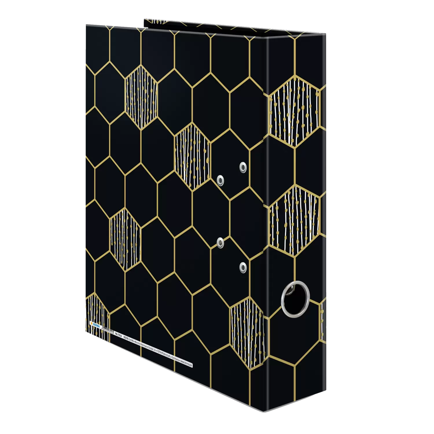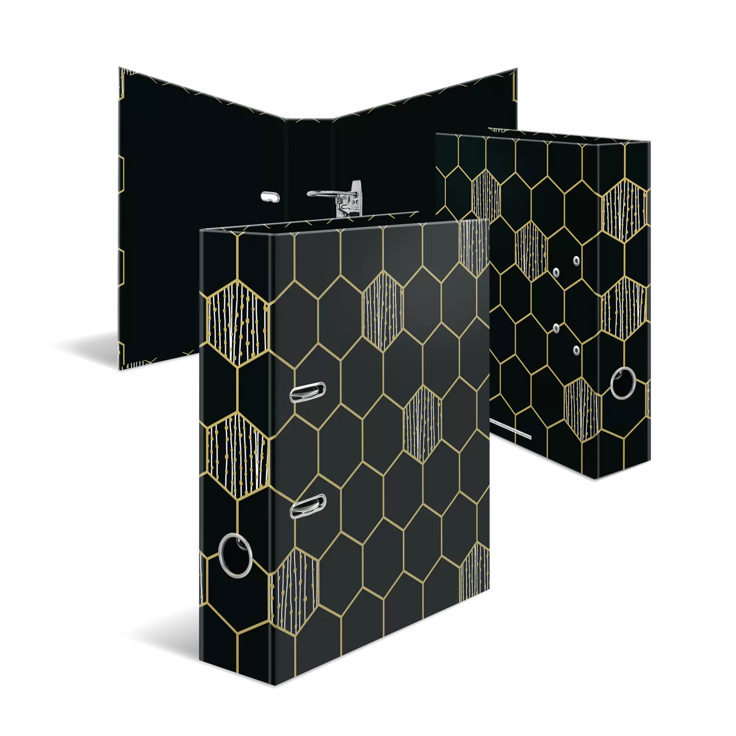 The motif file Hexagon is something very special because it combines design and functionality at the highest level. The pattern of hexagonal shapes, framed by delicate gold lines and decorated with botanical-looking golden dots. A highlight and eye-catcher! The file is made of high-quality cardboard, refined with gold foil and easy to take out and put back again thanks to the practical thumb hole. The special lever arch mechanism with metal compressor bar keeps the contents of the file organised and stable. The wide spine guarantees stability on the shelf and sufficient space for many documents in formats up to A4.