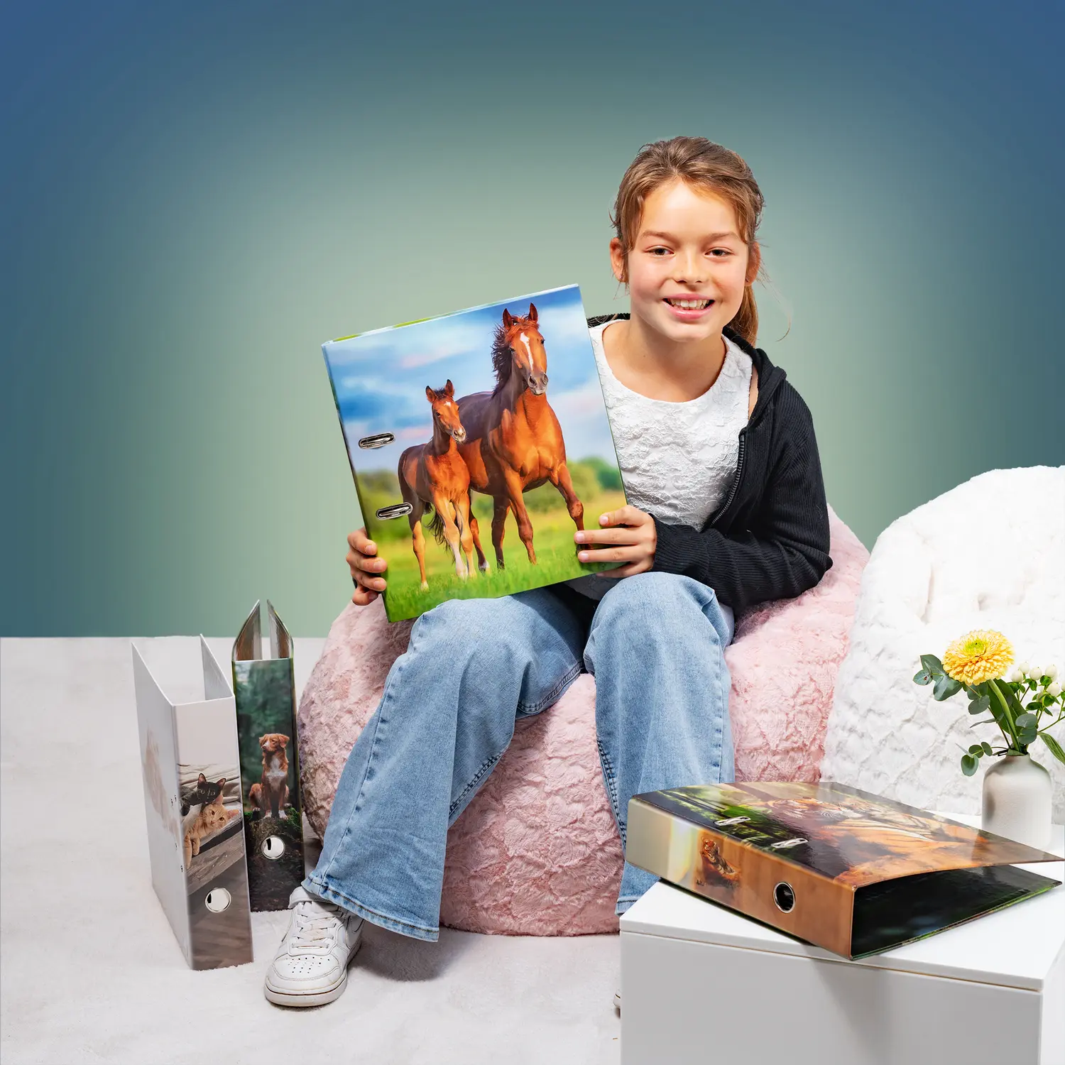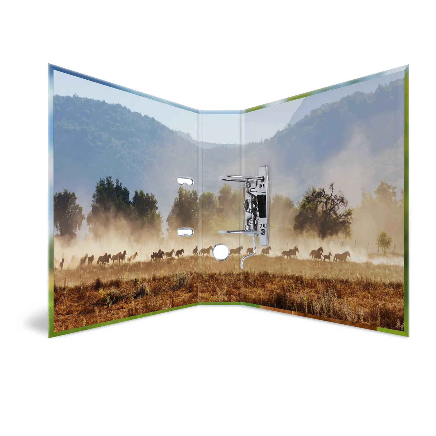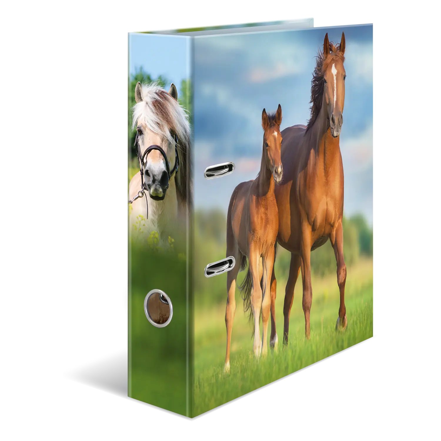 The motif horses of HERMA's series "Favourite Animals" invites you to discover the peace and beauty of horses. These unique motif files capture the gentle grace of animals and bring a touch of harmony to eve ryday life. Made of extra sturdy cardboard with high quality workmanship, they not only provide ideal storage for important documents, but are also an inspiring eye catcher on the desk or shelf. The robust lever mechanism ensures that everything stays firmly in place. The elegance of these wonderful animals is inspiring and transforms organising into a creative experience full of life. A personal favourite animal file ensures order that is both practical and inspiring.