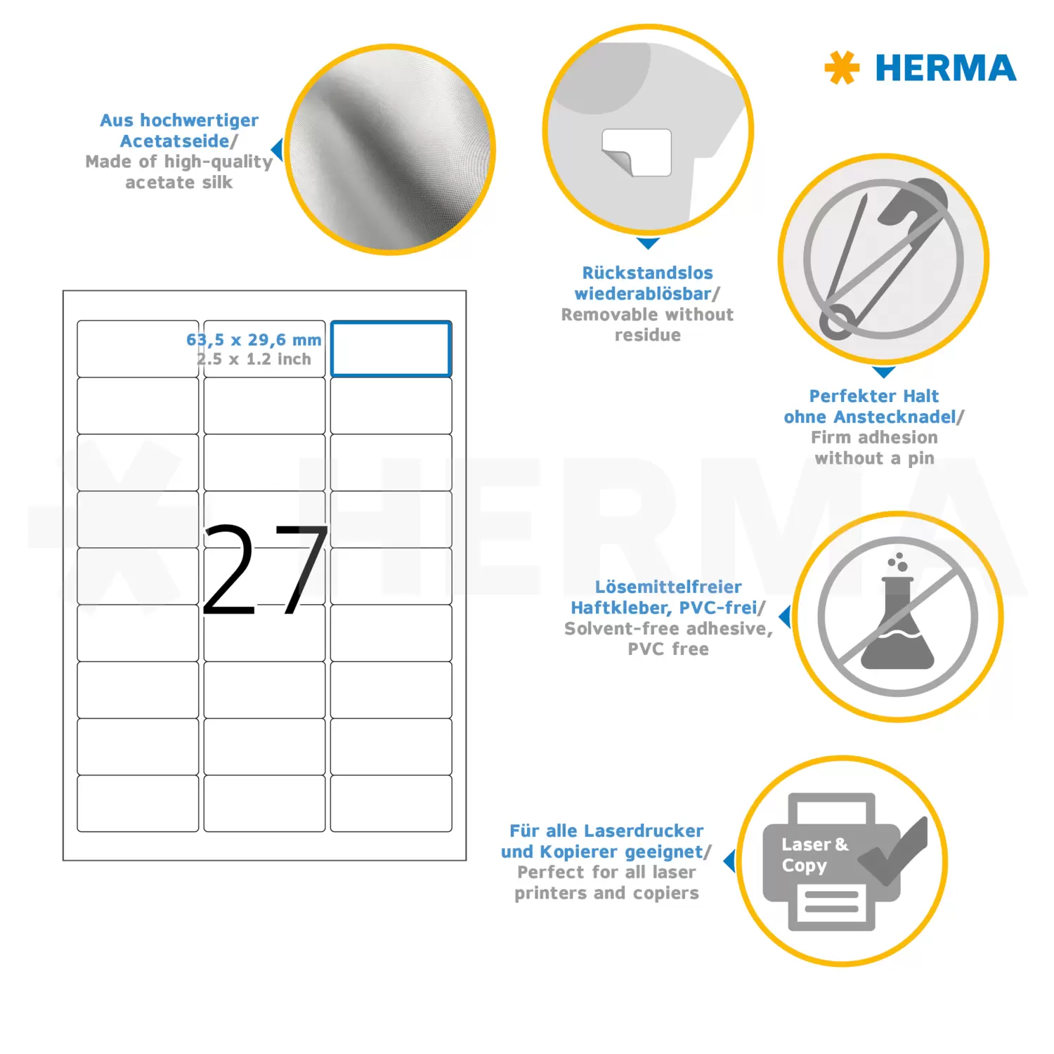 Name/textile labels removable A4, 63,5 x 29,6 mm, white made of acetate silk, printable