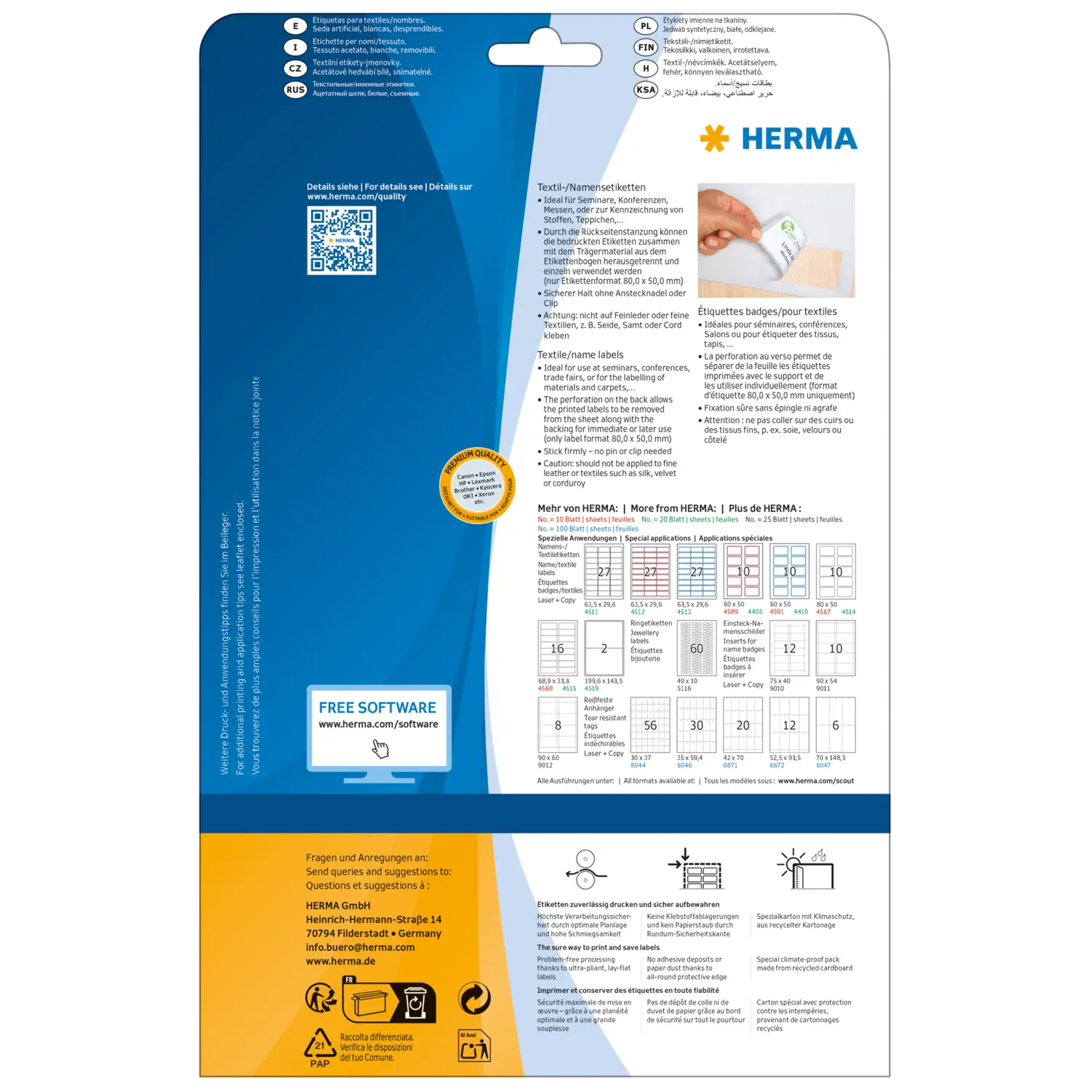 - Ideal for use at seminars, conferences and trade fairs (also for labelling fabrics, mattresses and carpets)