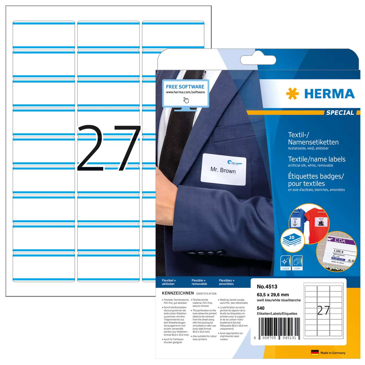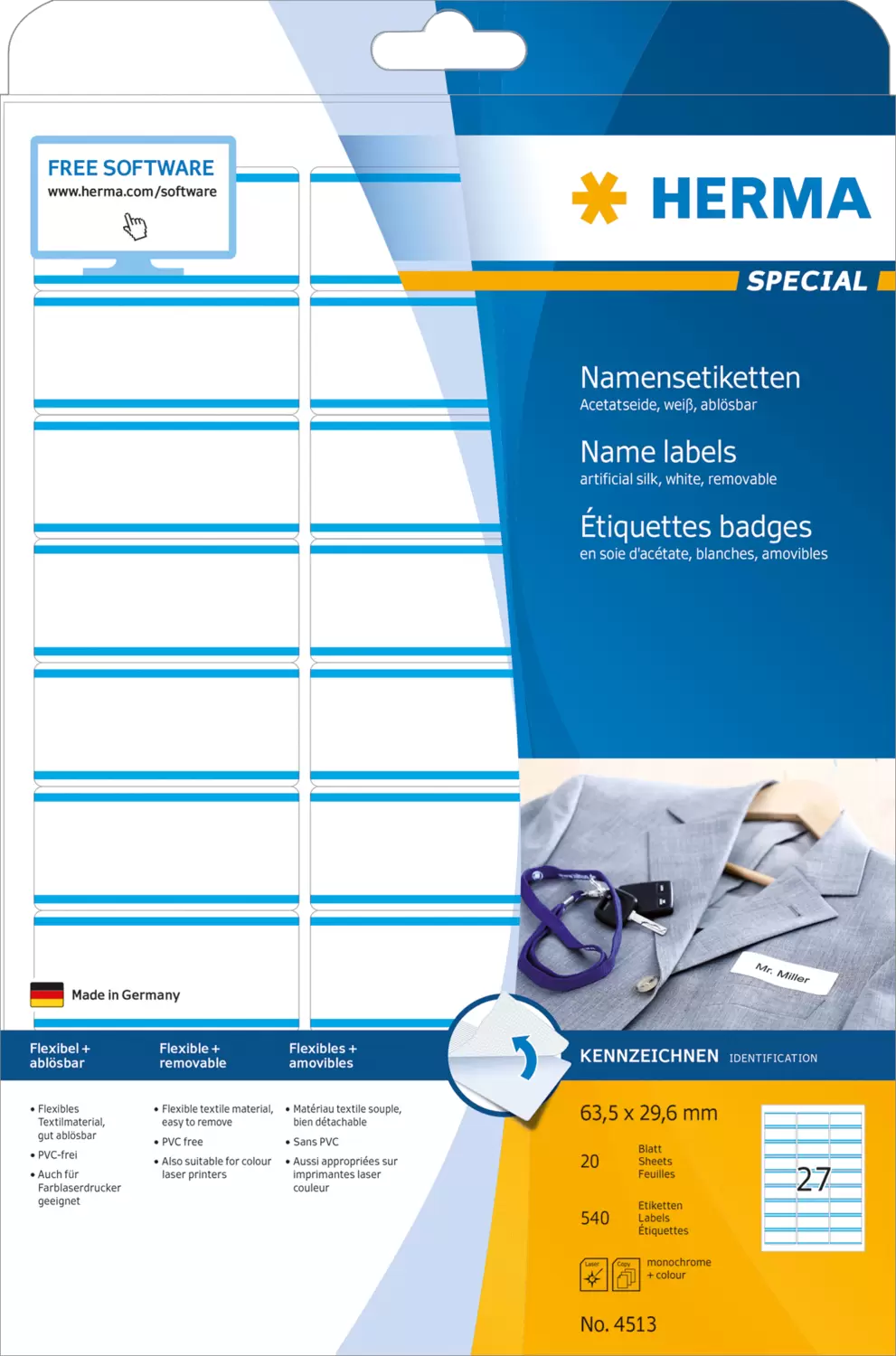 Labels made of acetate silk, on A4 sheets, self-adhesive. Ideal for use at seminars, conferences, trade fairs, or for the labelling of fabrics, carpets and mattresses. A handy alternative to plastic badges: quick printing, firm adhesion without a pin or clip. Flexible textile material, reliable adhesion, easy to remove. Caution: should not be applied to fine leather or textiles such as silk, velvet or corduroy. For laser printers, copiers, colour laser printers and colour copiers. Not suitable for inkjet printers. Free software solutions: www.herma.com/software