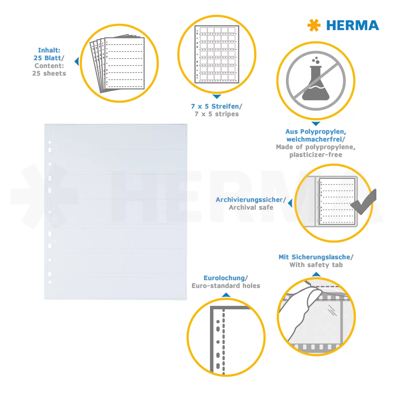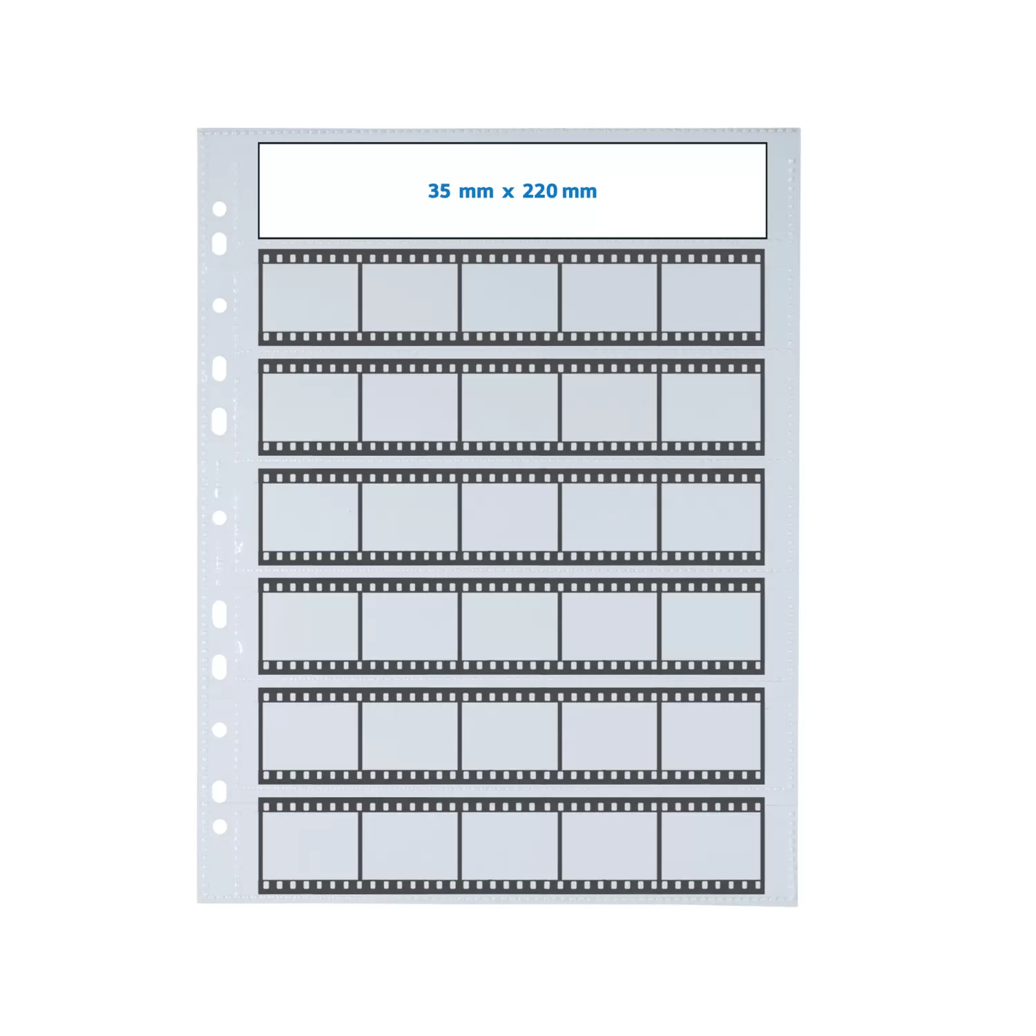 HERMA negative pockets for 35 mm negatives are ideal for neat and tidy storage and archiving of negative stripes. They are made of transparent, robust and plasticizer-free polypropylene and offer space per pocket for 7 stripes of 5 pictures each in 35 mm format. The particular feature are special safety tabs that prevent the negatives from falling out of the pockets. This makes it easy to insert and remove the negatives and yet they are optimally protected. One pocket measures approx. 24.3 x 29.7 cm and can be easily filed in files, ring binders or photobooks thanks to the Euro perforation. For optimal protection, we recommend the 4 ring version. There are 25 pockets in a pack and thus enough space for up to 175 stripes and 875 negatives.