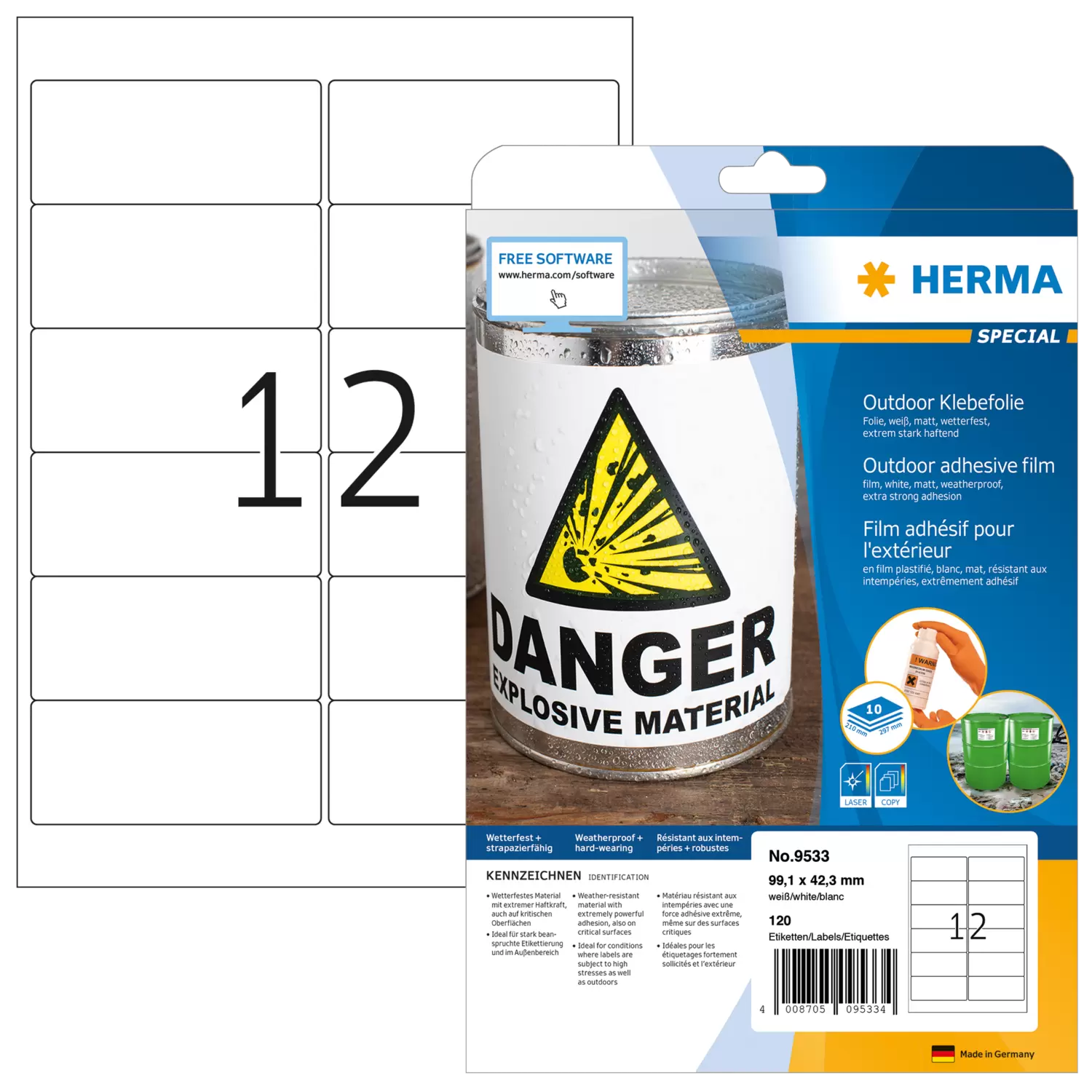 Weatherproof outdoor film labels A4, 99,1 x 42,3 mm, white, extremely strong adhesion, stretchable