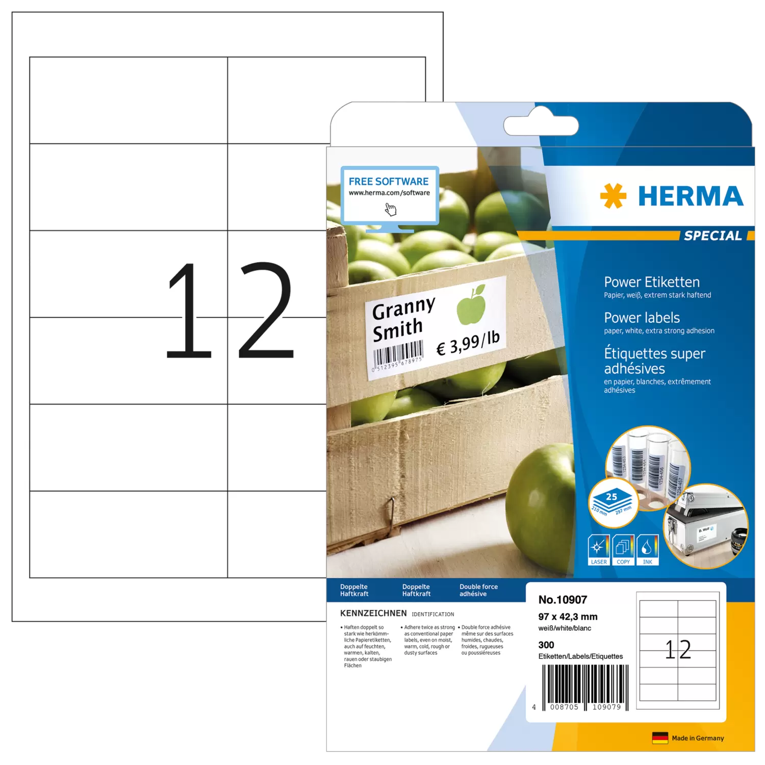 Extra-strength labels on A4 sheets, self-adhesive. Twice the adhesive strength of conventional paper labels, even on moist, warm, cold, rough or dusty surfaces. Ideal for reliable labelling of products, documents and objects in inventories, for safety messages, warning messages, wrap-around labels, test badges or seal labels. Indoor use. Environmentally friendly: high-quality, chlorine-free bleached special paper, FSC™ Mix Credit certified, solvent-free adhesive. Labels are 100% recyclable, dispose of as for waste paper, packaging made from recycled cardboard. Excellent printing results on all laser printers, inkjet printers, copiers, colour laser printers and colour copiers. Trouble-free processing thanks to all-round protective edge and optimum flatness. Free software solutions: www.herma.com/software.