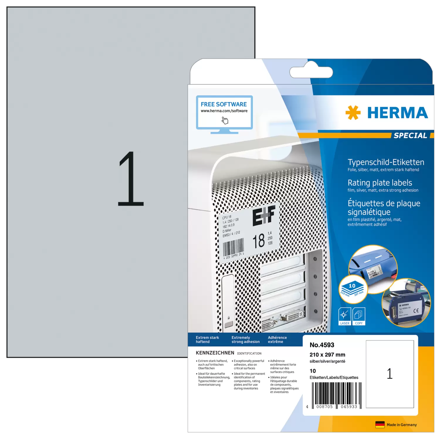 Silver labels made of matte polyester film, on A4 sheets, self-adhesive. Ideal for permanent labelling of components, rating plates and objects in inventories. High-quality stainless steel look. Resistant to weather and ageing, oil and dirt-repellent, tear-resistant, wet-wipeable, resistant to temperatures between -40°C and +150°C. Powerful adhesion, even on rough or critical surfaces. Trouble-free processing thanks to all-round protective edge and optimum flatness. For laser printers and copiers. Not suitable for inkjet printers, colour laser printers or colour copiers. Free software solutions: www.herma.com/software.