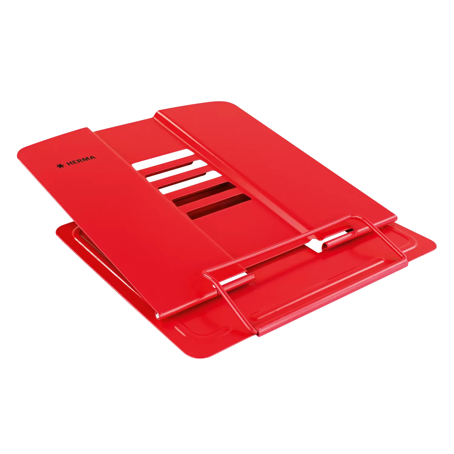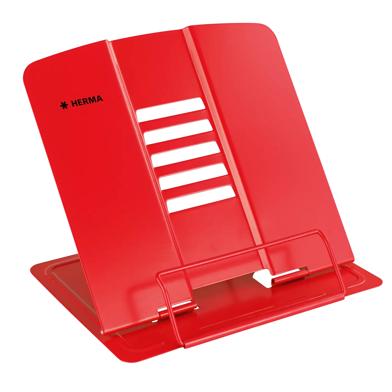 Reading stand, bookend, book and cookbook holder, tablet computer holder: there are many names for HERMA's unique and multifunctional reading rack. The reading rack is red, made of lacquered metal and has a height of 19 cm when opened, a width of 19.8 cm and a depth of 15.7 cm. It is therefore also ideal for heavy books, atlases and computer tablets. Its tilt angle can be adjusted to 5 different positions, making it comfortable for the neck to look at a book or tablet computer whether it's standing on the desk, on campus or in the kitchen. For a firm and optimal stand, it is equipped with slip-resistant knobs on the bottom. If it is not needed or has to be transported, it can be easily folded and stowed away. The multifunctional book stand is also available in the colors blue, white, pink and black. Perfect, for example, to give books, tablet computers, magazines, exercise books, music sheets and cookbooks, in different sizes, the perfect stand and hold. Flexible to use in the office or home office, when travelling, at school, on campus, in kindergarten, in the kitchen or at outdoor barbecues and at home on the sofa.