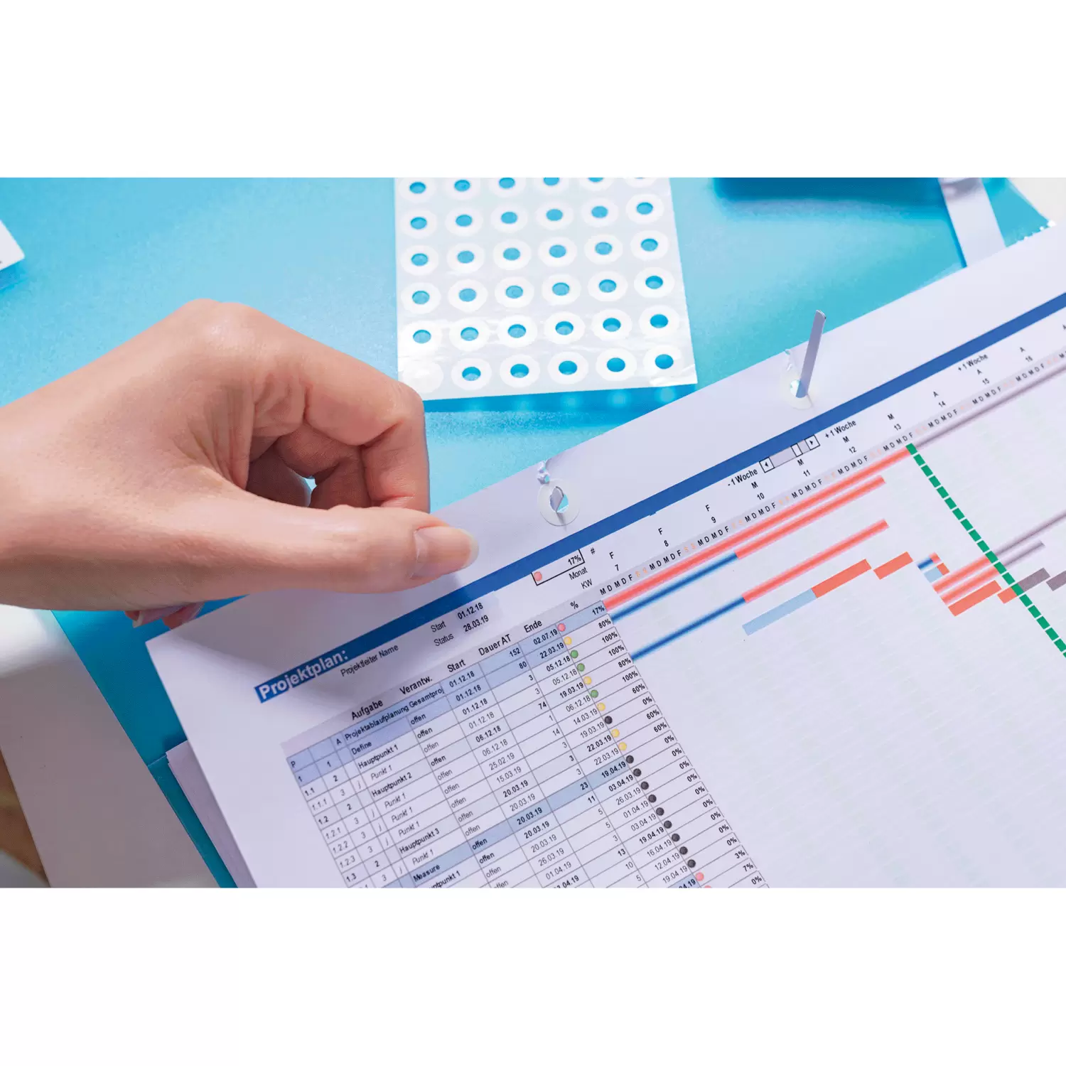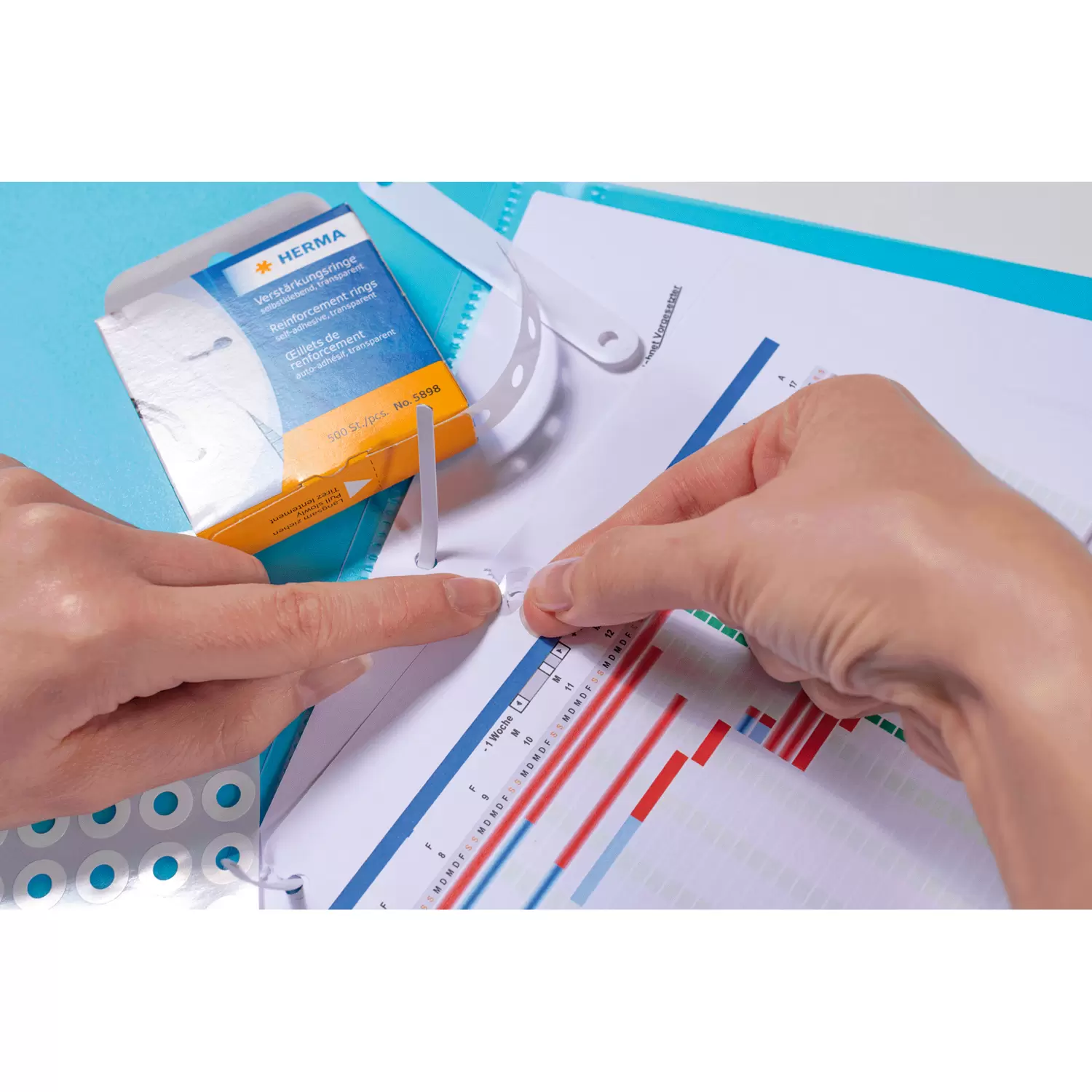 Self-adhesive reinforcement rings, made of tear-resistant transparent plastic film, for neatly and dependably reinforcing of repairing file attachment holes. Outer diameter 12 mm.