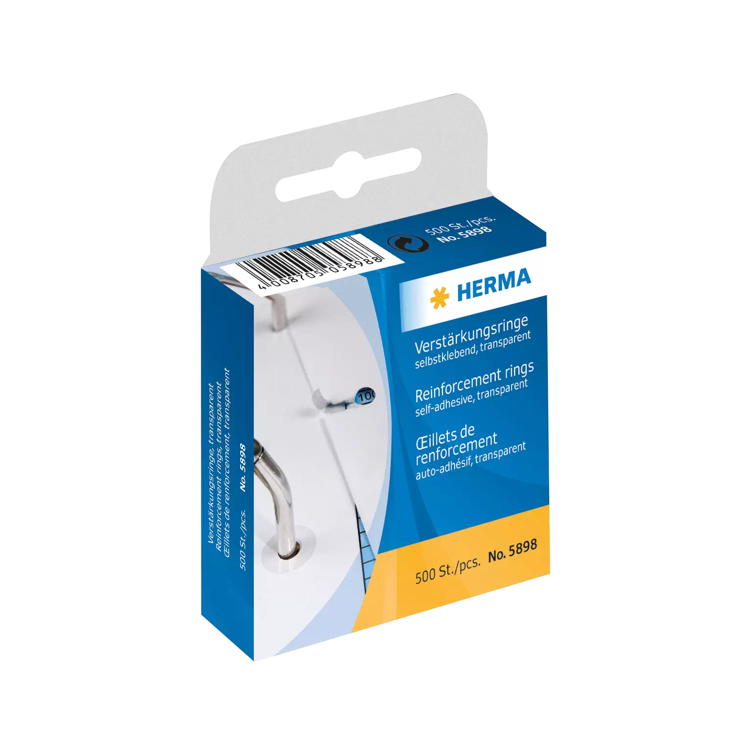 Self-adhesive reinforcement rings, made of tear-resistant transparent plastic film, for neatly and dependably reinforcing of repairing file attachment holes. Outer diameter 12mm. In functional cardboard dispenser.