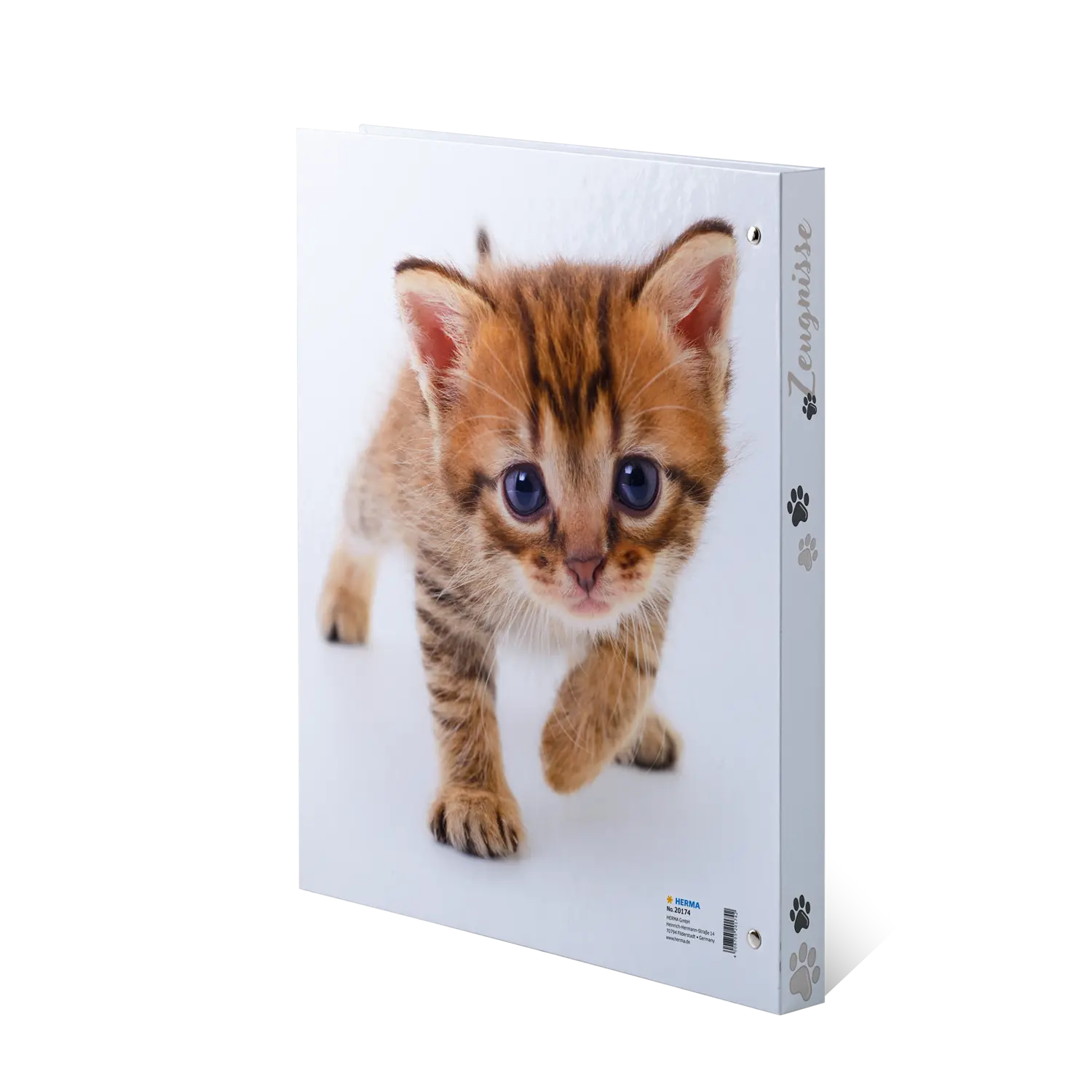 The HERMA Certificate Ring Binder Cat in DIN A4 format impresses with its cute cat motifs and stylish glossy design. The sturdy, fully printed cover with inner printing reliably protects certificates, diplomas and important documents. Thanks to the 4 ring mechanism and compressor bar, documents can be easily organized and exchanged. Includes 10 crystal clear brochure sleeves for up to 20 sheets. A practical, writable table of contents provides structure and additional overview. Ideal for school, training and cat lovers who value style and structure.