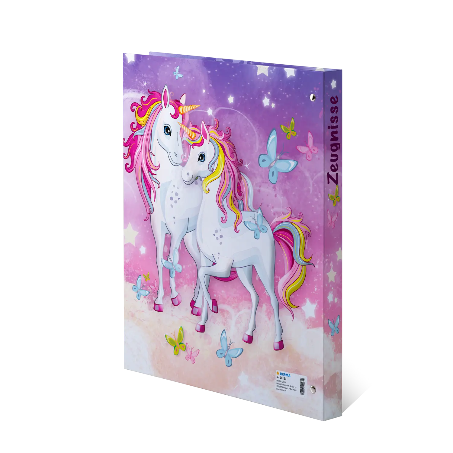 The HERMA Certificate Ring Binder Unicorn in A4 format brings a magical sparkle to everyday school life. The sturdy, fully printed cover with inner printing features an enchanting fantasy design in a glossy finish. Thanks to the 4 ring mechanism and the metal compressor bar, documents can be easily organized and exchanged. Includes 10 crystal clear brochure sleeves for up to 20 sheets. A practical, writable table of contents provides structure and additional overview. Ideal for school, training and unicorn lovers who want to keep their dreams and successes in style.