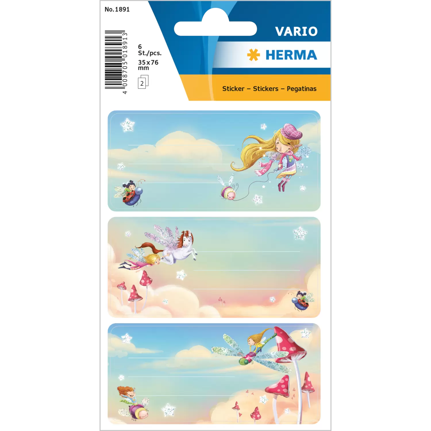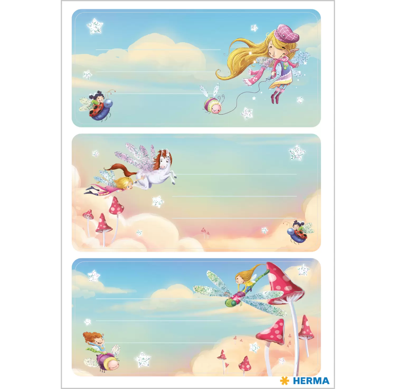 Practical and shimmering, for all girls: Cute, pretty and nobly glittering, the fairies play with their friends on the school labels. These beautiful school labels in 76x35 mm format, combine design with perfect functionality. Simply write on the self-adhesive paper stickers quickly and easily by hand, peel them off, stick them on - that's all. So no book and exercise book can be mixed up at school, kindergarten or among friends.