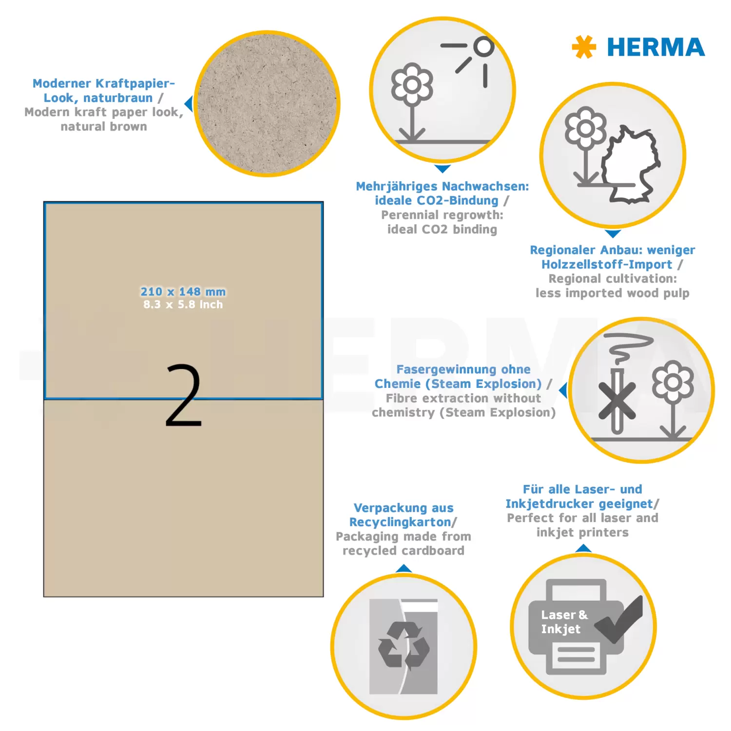 Special paper made from the queen of ecological crops: Danube silphie. An important habitat for bees, cultivated as an energy crop, ideal for binding CO2, valuable for the ecosystem. A contribution to sustainability. FSC™ Mix Credit certified. Grown in Germany, short transport routes, lower CO2 emissions. Modern kraft paper look, with at least 35% silphie fibre content. (Variations in color tone possible due to environmentally friendly raw material). Suitable for direct contact with foodstuffs. Label paper recyclable as waste paper. End-to-end sustainability: labels and packaging. Excellent printing results on all laser printers, inkjet printers, copiers, colour laser printers and colour copiers. Free software solutions: www.herma.com/software.