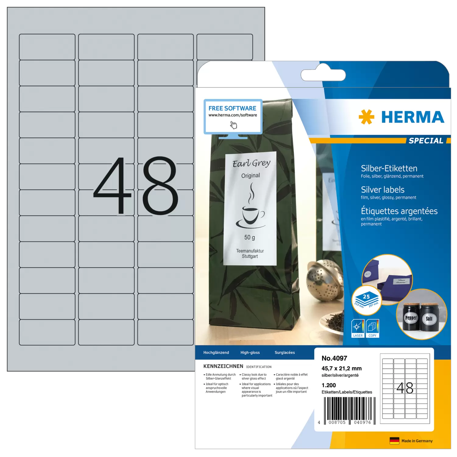 Silver foil labels A4, 45,7 x 21,2 mm, glossy, weatherproof, permanent adhesion