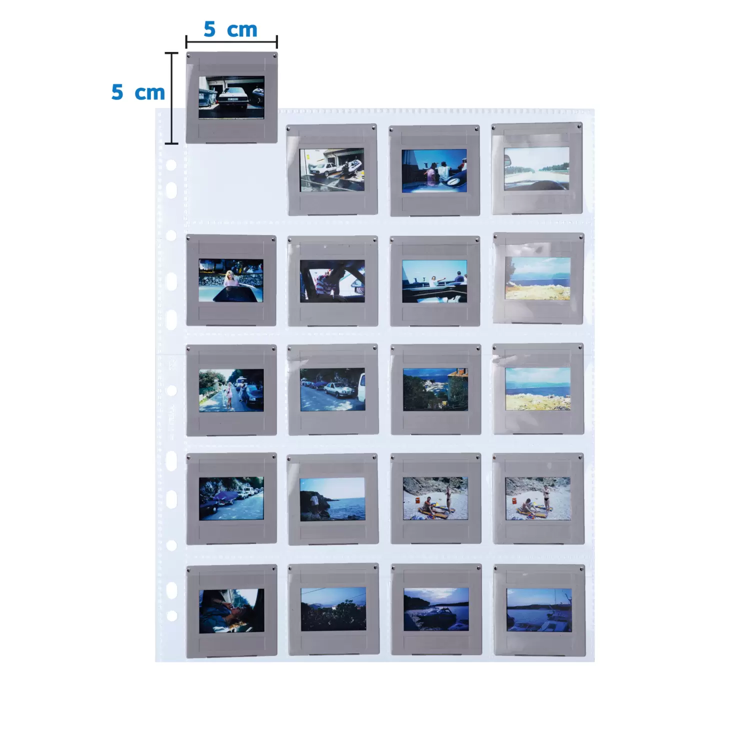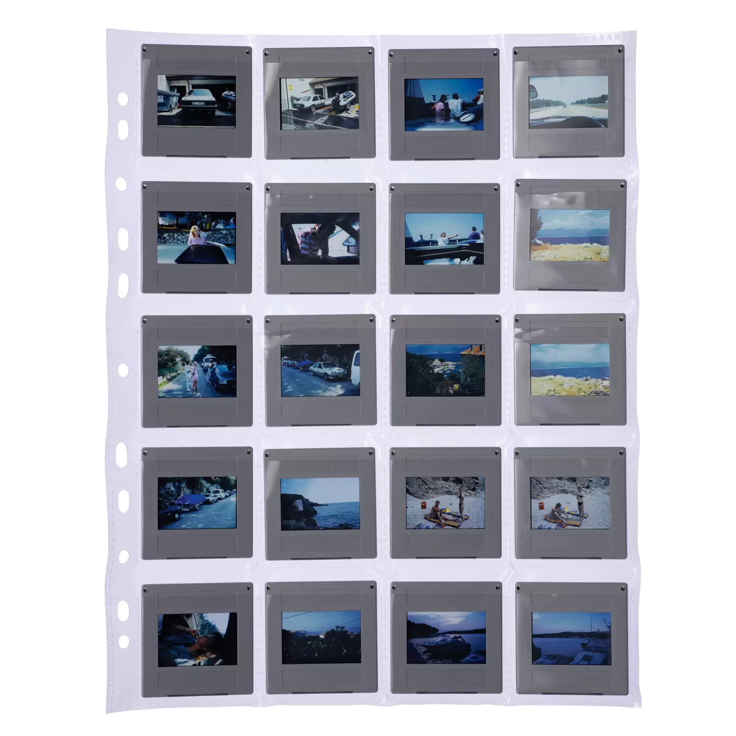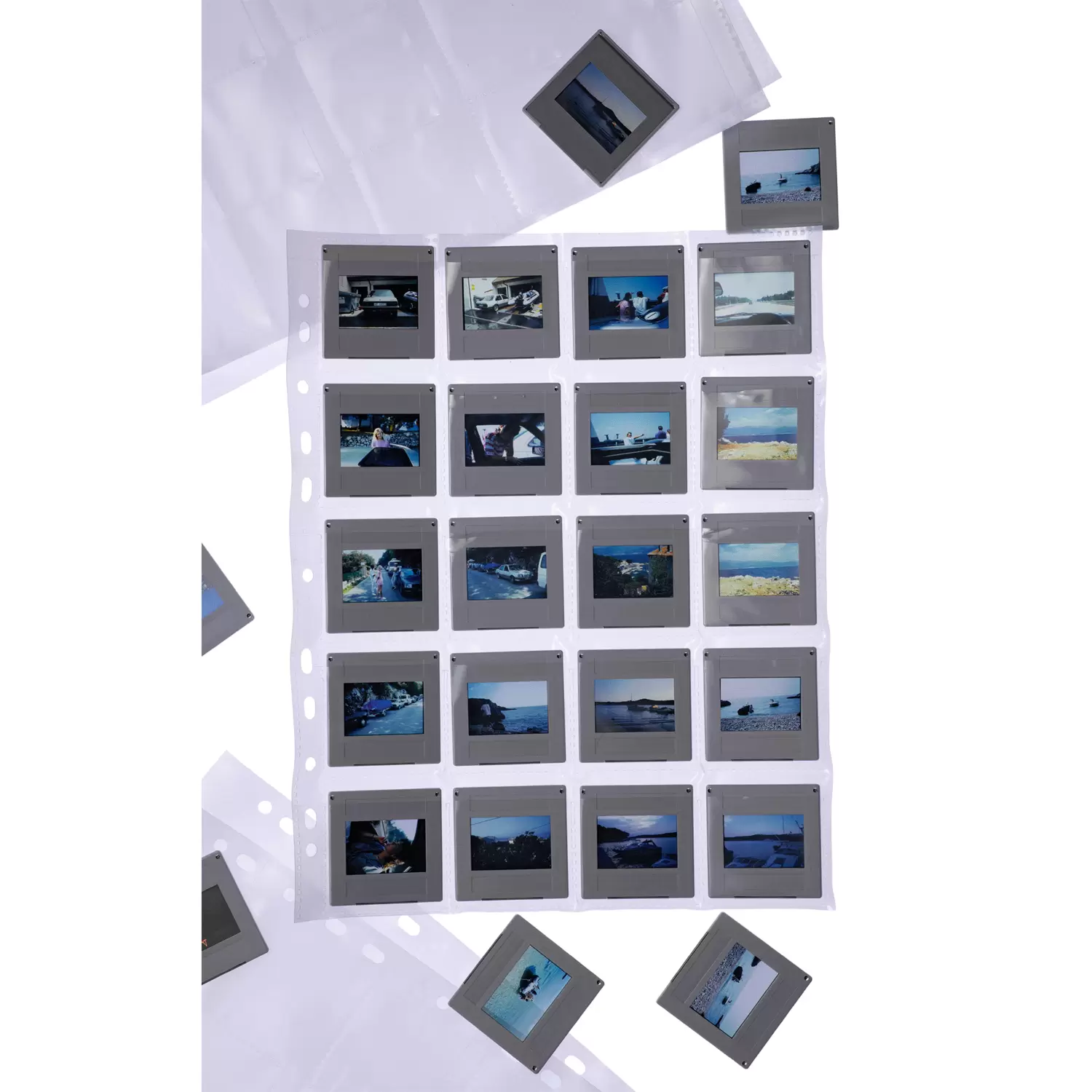 HERMA slide pockets are ideal for neat and tidy storage and archiving of 35 mm slides. They are made of transparent, robust and plasticizer-free clear matt polypropylene and offer space per pocket for 20 mounted slides in 50 x 50 mm format. The particular feature are special safety tabs that prevent the slides from falling out of the pockets. This makes it easy to insert and remove the slides and yet they are optimally protected. One pocket measures approx. 24.4 x 30.1 cm and can be easily filed in files, ring binders or photobooks thanks to the Euro perforation. For optimal protection, we recommend the 4 ring version. There are 10 pockets in a pack and thus enough space for up to 200 slides.