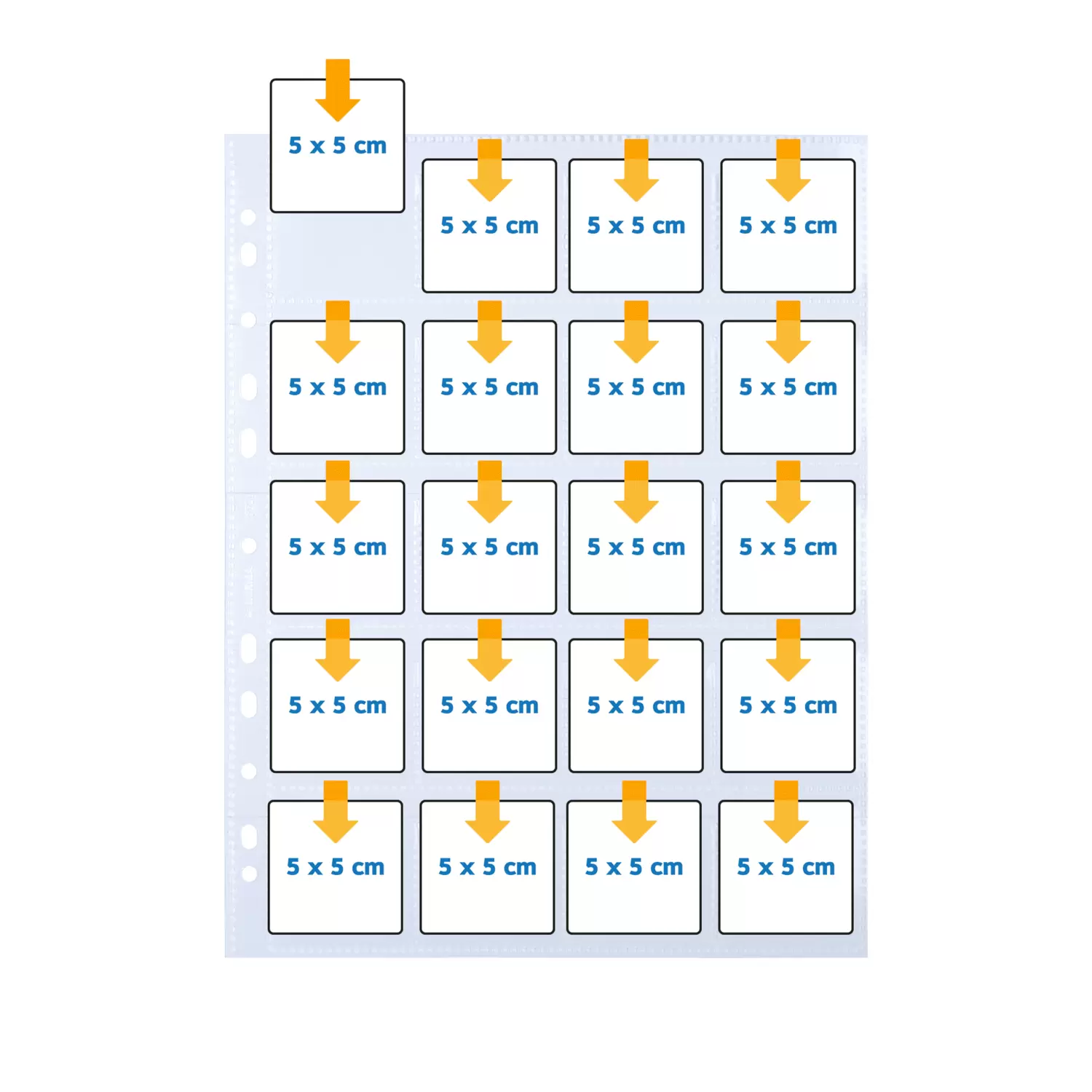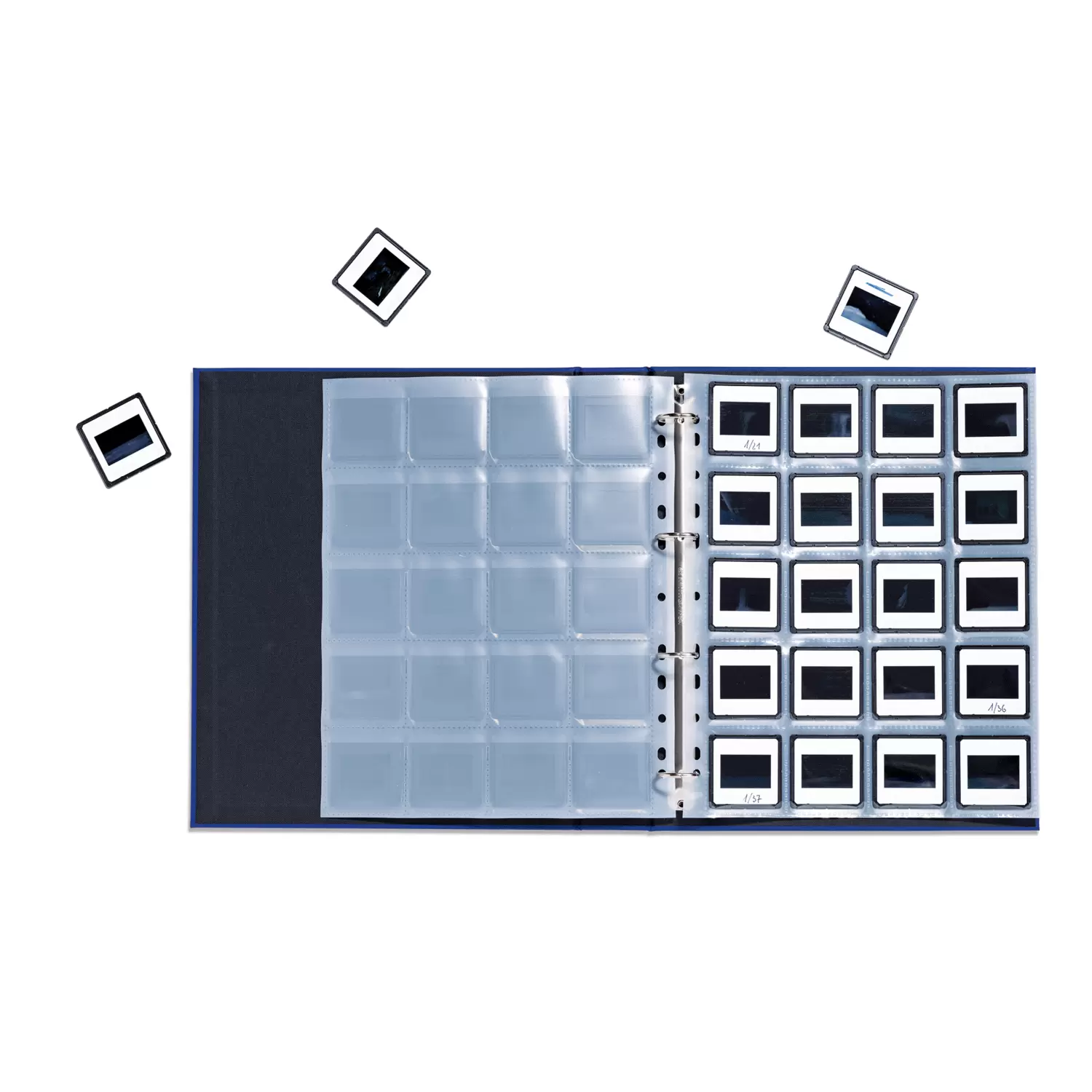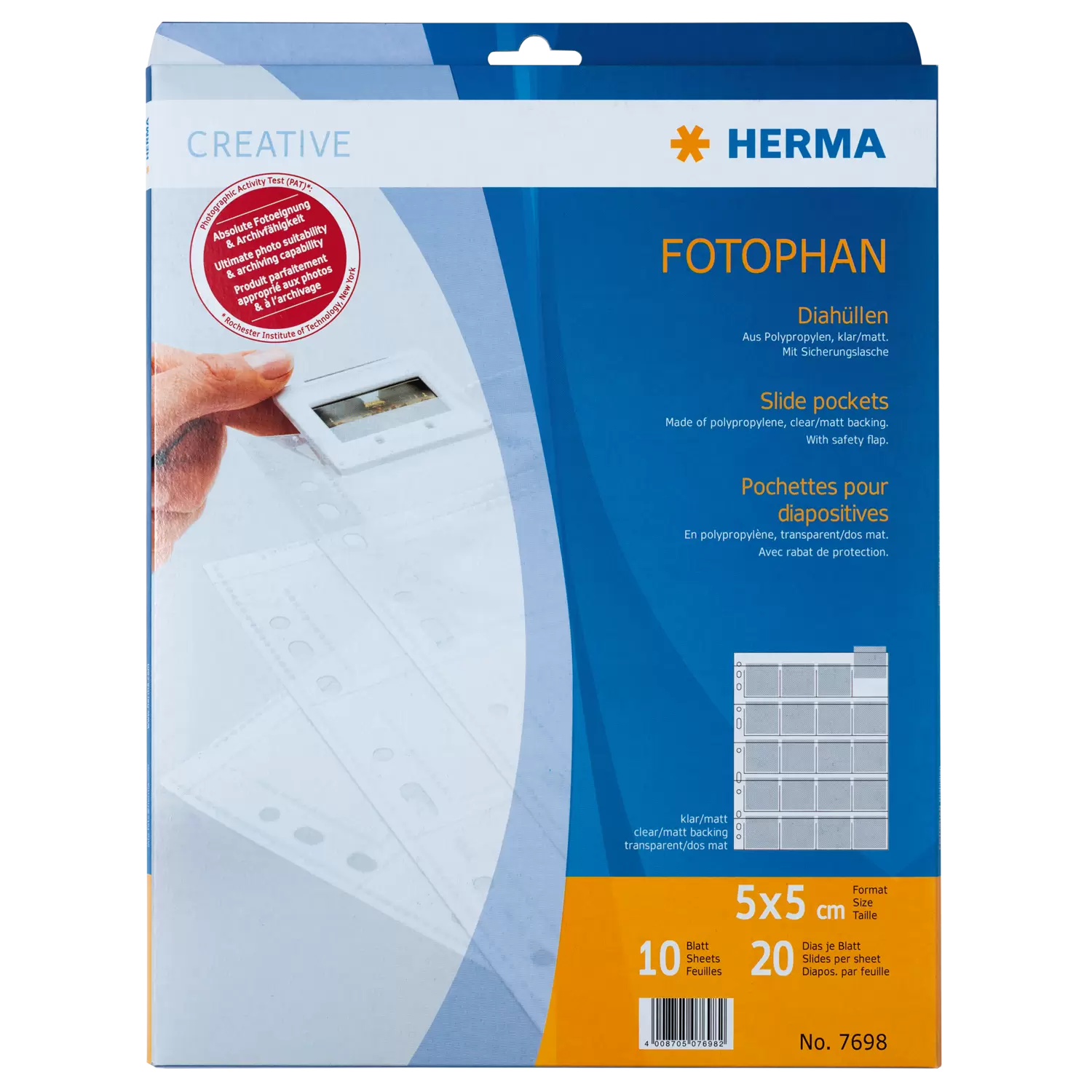 HERMA slide pockets are ideal for neat and tidy storage and archiving of 35 mm slides. They are made of transparent, robust and plasticizer-free clear matt polypropylene and offer space per pocket for 20 mounted slides in 50 x 50 mm format. The particular feature are special safety tabs that prevent the slides from falling out of the pockets. This makes it easy to insert and remove the slides and yet they are optimally protected. One pocket measures approx. 24.4 x 30.1 cm and can be easily filed in files, ring binders or photobooks thanks to the Euro perforation. For optimal protection, we recommend the 4 ring version. There are 10 pockets in a pack and thus enough space for up to 200 slides.