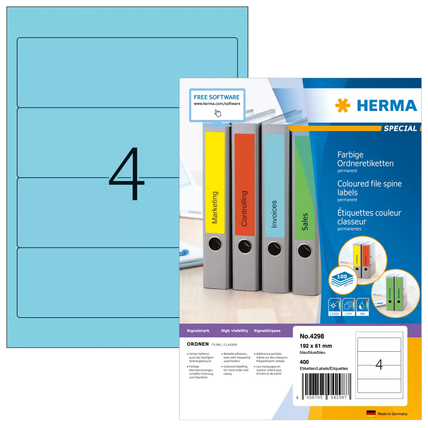 File labels A4, 192 x 61 mm, blue, for wide files (short)