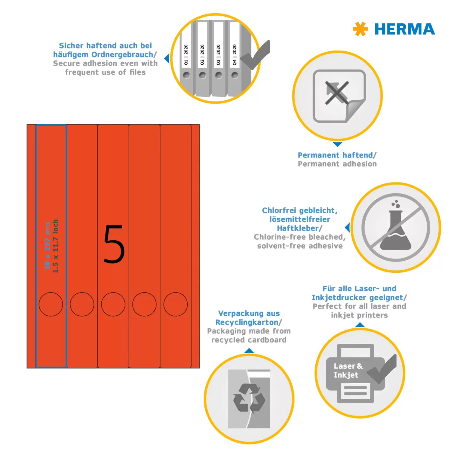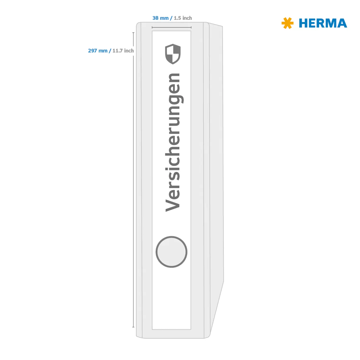 File spine labels on A4 sheets, self-adhesive. For a uniform appearance at the office and at home. For all standard files. Blank: ideal for company logos, inscriptions and organization notes. Reliable adhesion, even with frequently used files. Environmentally friendly: high-quality, chlorine-free bleached special paper, solvent-free adhesive. Labels are 100% recyclable, dispose of as for waste paper, packaging made from recycled cardboard. Excellent printing results on all laser printers, inkjet printers, copiers, colour laser printers and colour copiers. Trouble-free processing thanks to all-round protective edge and optimum flatness. Free software solutions: www.herma.com/software.