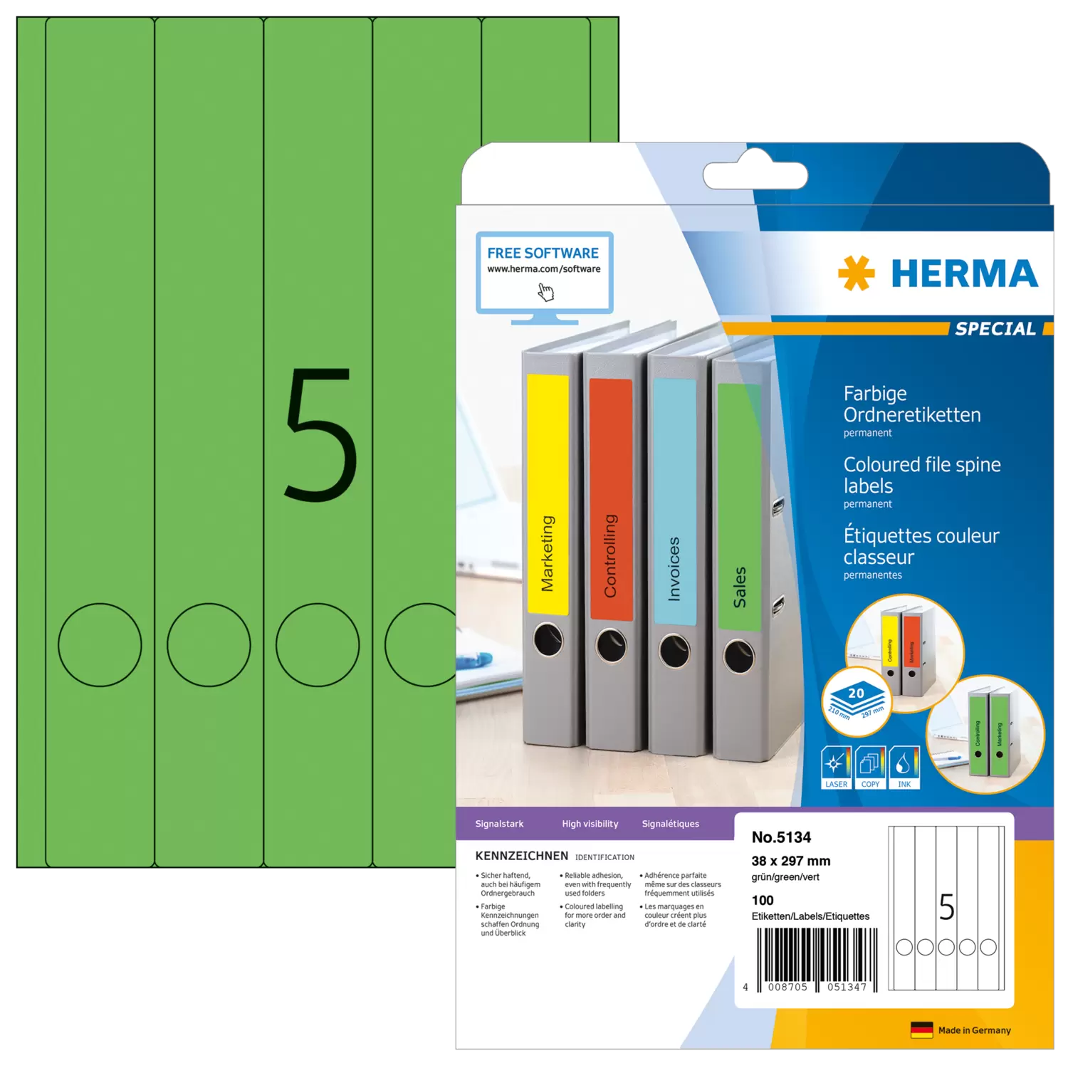 File spine labels on A4 sheets, self-adhesive. For a uniform appearance at the office and at home. For all standard files. Blank: ideal for company logos, inscriptions and organization notes. Reliable adhesion, even with frequently used files. Environmentally friendly: high-quality, chlorine-free bleached special paper, solvent-free adhesive. Labels are 100% recyclable, dispose of as for waste paper, packaging made from recycled cardboard. Excellent printing results on all laser printers, inkjet printers, copiers, colour laser printers and colour copiers. Trouble-free processing thanks to all-round protective edge and optimum flatness. Free software solutions: www.herma.com/software.