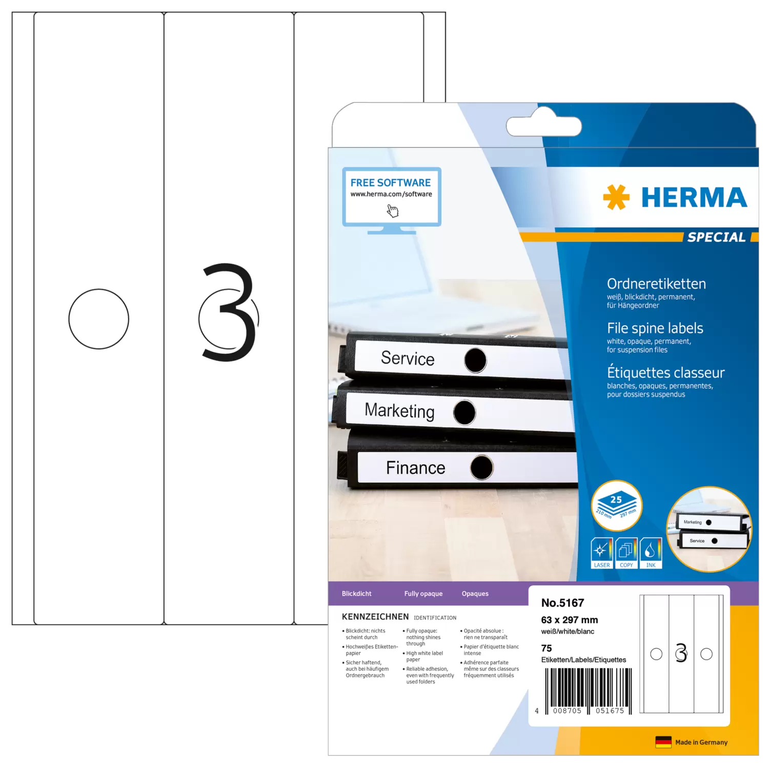 File spine labels on A4 sheets, self-adhesive. For a uniform appearance at the office and at home. For all standard files. Fully opaque material with high whiteness, old lettering does not show through. Blank: ideal for company logos, inscriptions and organization notes. Reliable adhesion, even with frequently used files. Environmentally friendly: high-quality, chlorine-free bleached special paper, FSC™ Mix Credit certified, solvent-free adhesive. Labels are 100% recyclable, dispose of as for waste paper, packaging made from recycled cardboard. Excellent printing results on all laser printers, inkjet printers, copiers, colour laser printers and colour copiers. Trouble-free processing thanks to all-round protective edge and optimum flatness. Free software solutions: www.herma.com/software.
