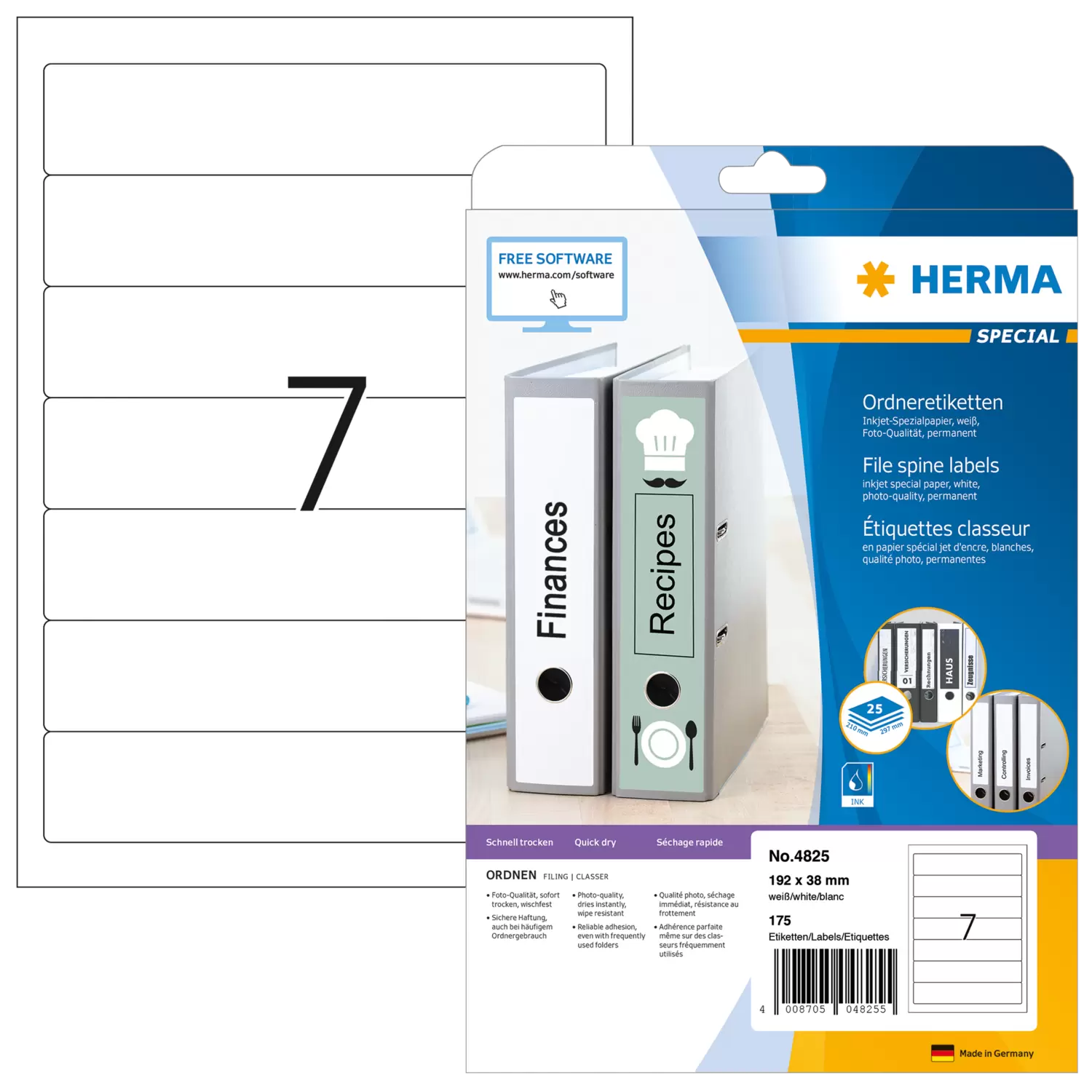 Inkjet file spine labels A4, 192 x 38 mm, white, permanent adhesion, for narrow files (short)
